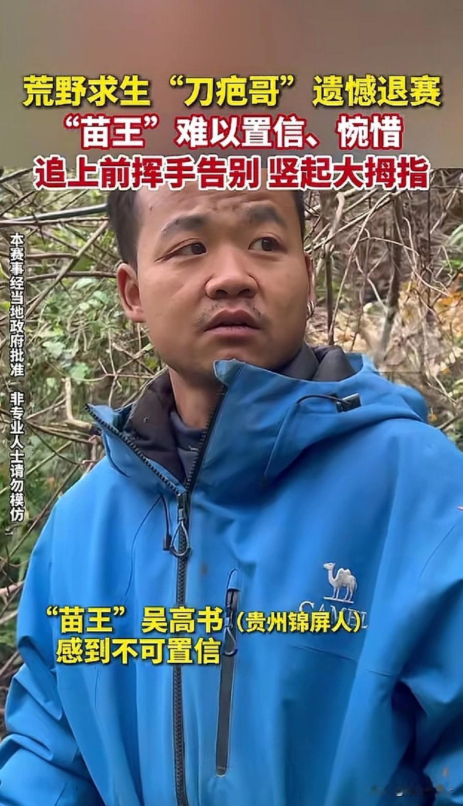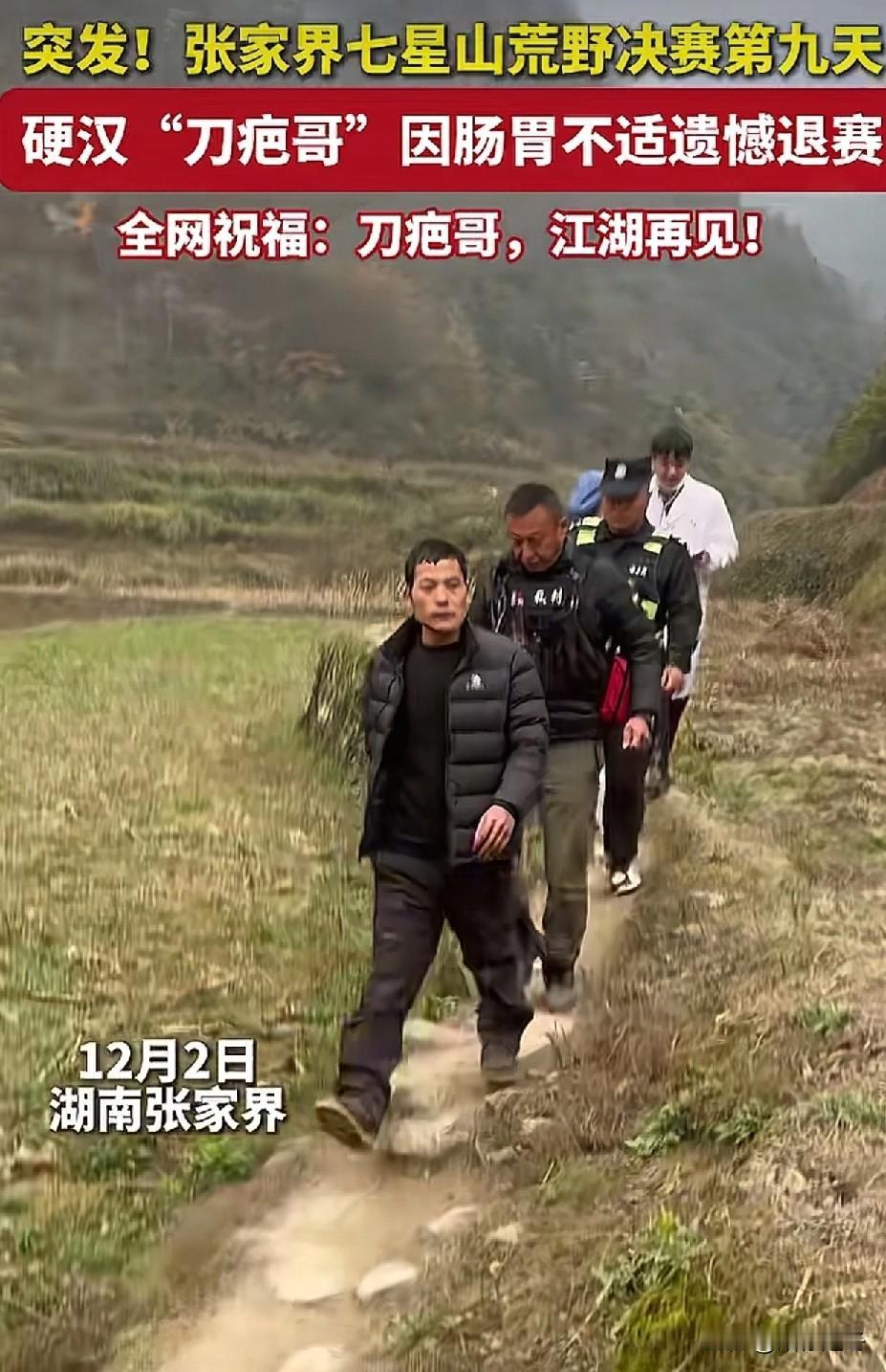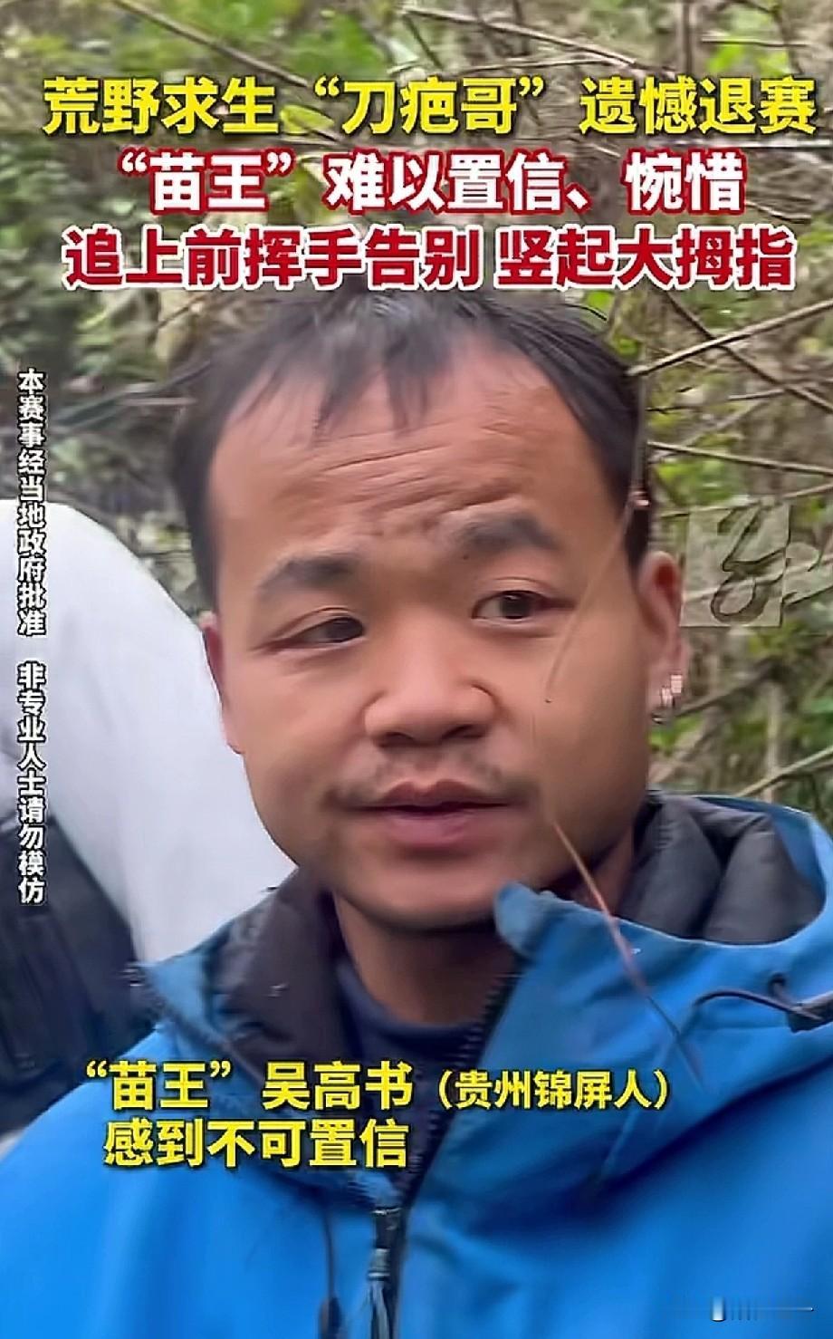 刀疤哥退赛,苗王含泪挥手告别![流泪] 万万没想到热门夺冠选手“刀疤哥”居然退赛了,此时最难过的却是苗王,他们既是老乡,也是竞争对手,还是他的好哥哥,除了吃惊意外,更多的是遗憾吧! 12月2日上午,七星山荒野求生人气选手“刀疤哥”,在决赛的第9天选择主动退赛了,此消息一出震惊所有人,因为在大家印象中他野外生存能力绝对是排到前三的,只能说是非常遗憾吧!毕竟身体健康才是第一位! 此外,当苗王得知刀疤哥退赛后,脸上写满吃惊和质疑,感叹说道:“我想到谁都会退赛,就是没有想到会是他,如今贵州只剩下我一个人了!” 他们都是最普通的底层人,因为节目结缘成为好朋友,一起走到决赛理解对方的不易,所以此刻最多的就是惋惜,苗王望着刀疤哥的背影眼含热泪挥手告别,并为其竖起大拇指。眼神里的没落清晰可见![赞] 目前据赛方透露和刀疤哥证实是因为肠胃不适原因退赛的,好好养身体吧,结局其实并不重要了,毕竟已经尽力了,你是最棒的!加油!荒野刀疤哥