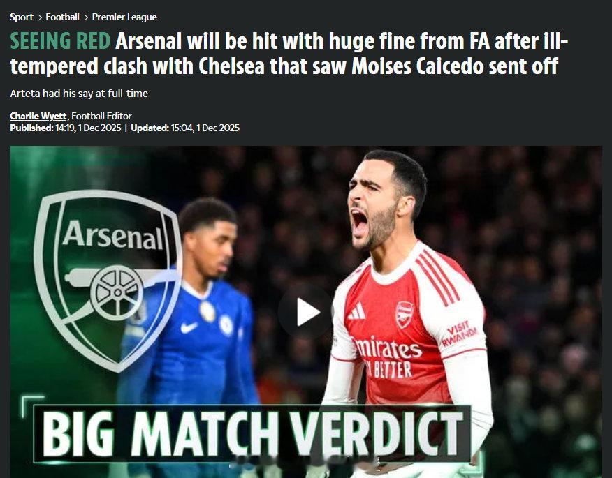 但凡看过比赛都知道切尔西脏,《太阳报》透露,阿森纳因在对阵切尔西的英超比赛中,祖比门迪、莫斯克拉、卡拉菲奥里、因卡皮耶、斯凯利和约克雷斯均被裁判出示黄牌警告,将被英足总处以2.5万镑罚款 英超联赛 阿森纳著名教授