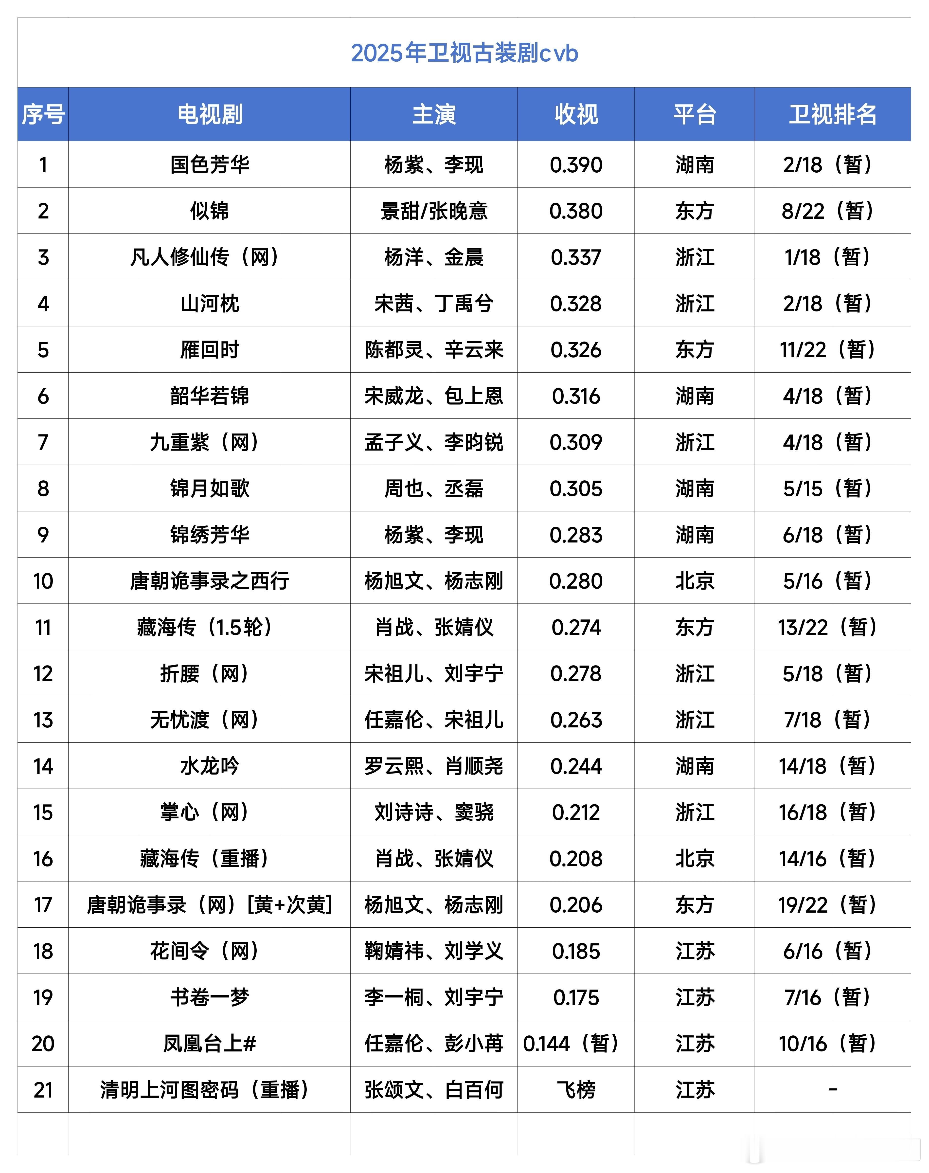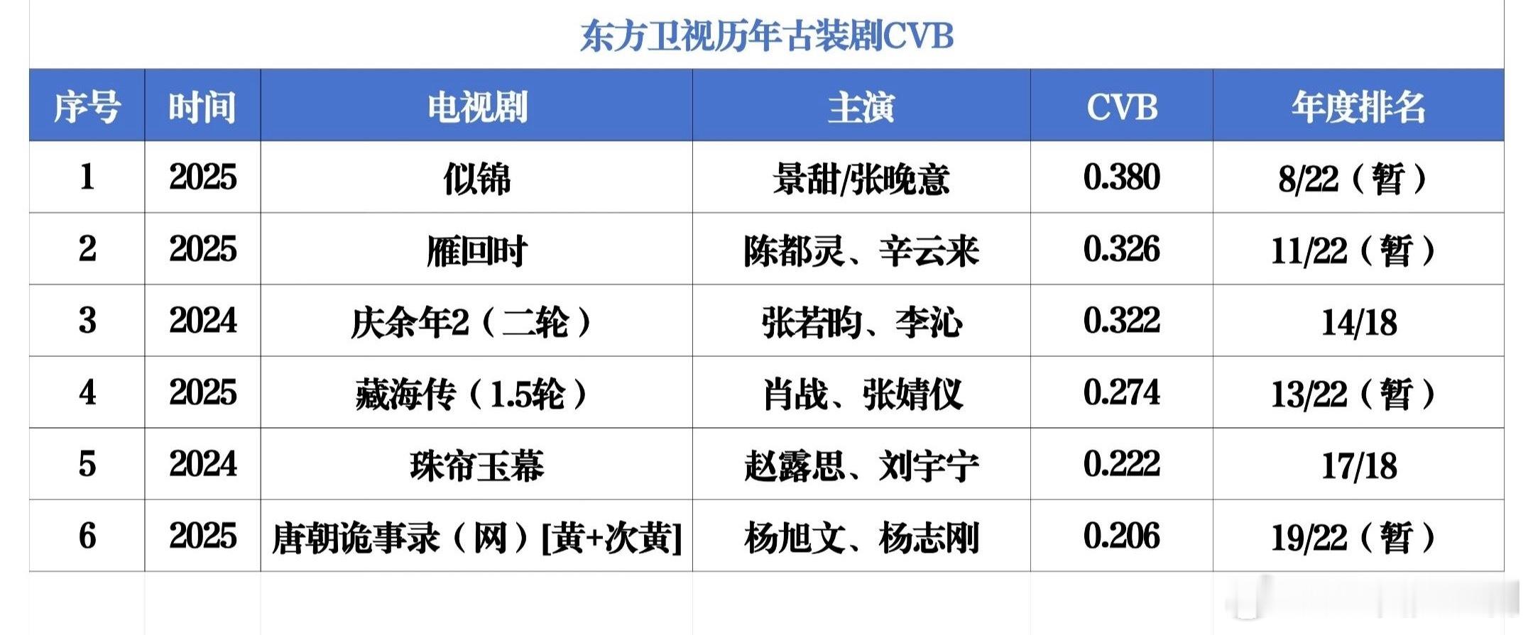 张晚意《似锦》东方卫视历年古装剧TOP1,2025年古装剧CVB年亚,2025年东方卫视古装剧TOP1,热烈祝贺我们《似锦》。小成本宣发,回报率高,性价比高!