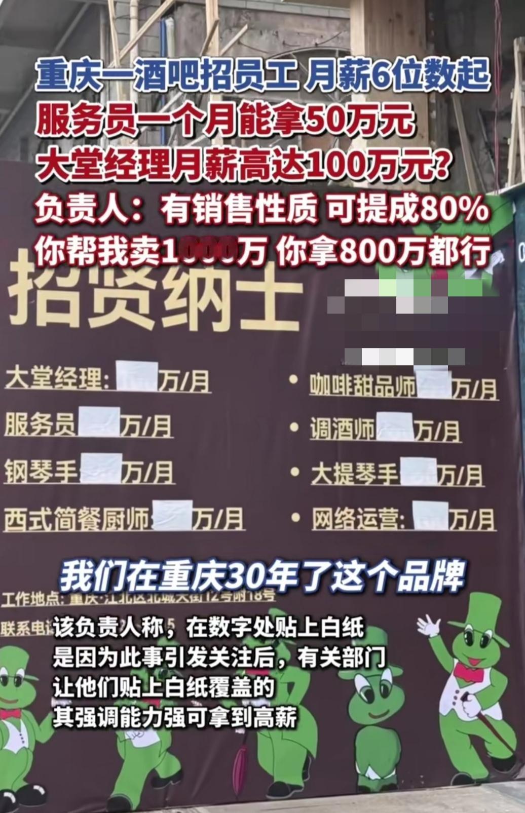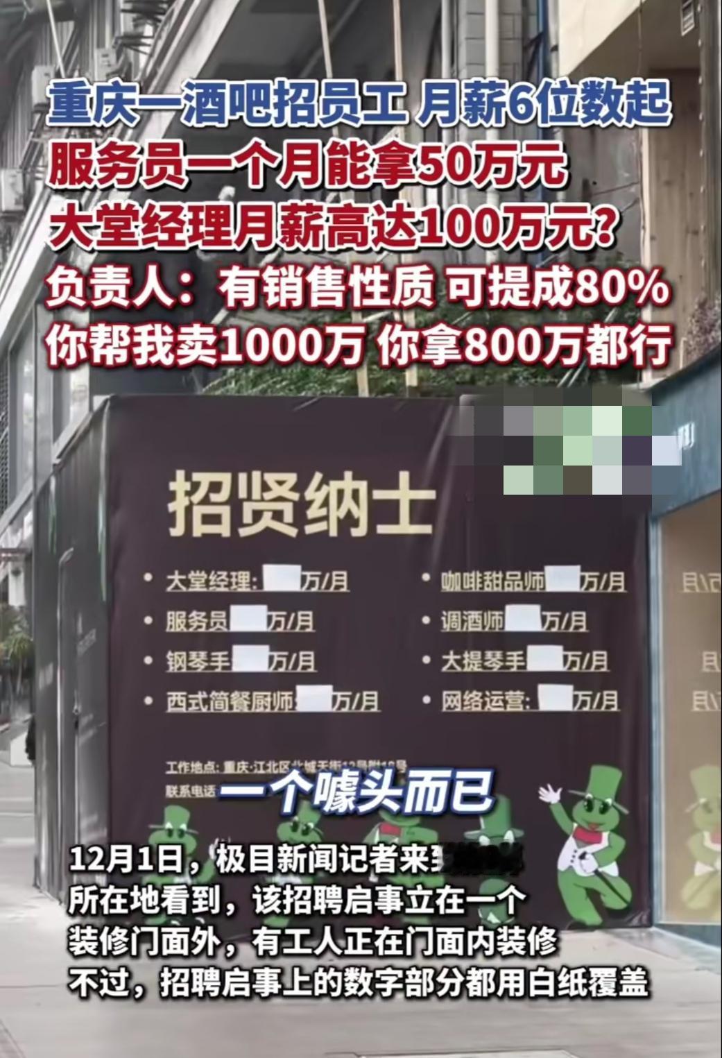 重庆观音桥商圈那张天价招聘启事,看着就让人心酸——服务员月薪50万、大堂经理100万,明晃晃的数字,戳中了多少想拼命赚钱的普通人。 可细看才知全是套路:薪资80%靠卖储值卡提成,没底薪,服务员得月卖62.5万才够50万工资,远超行业常规。现在监管介入,招聘数字被白纸盖住,只剩一地尴尬。 这哪是招聘?是抓住普通人急着翻身的心思画大饼。多少人抱着希望投简历,最后发现是镜花水月。行业常规提成才5%-10%,这种离谱薪资,本就是不可能实现的幻想。 最遗憾的是,总有人被“高薪”迷惑,忽略背后的陷阱。生活难是真的,但脚踏实地才靠谱,那些看似诱人的捷径,往往藏着最深的失望。