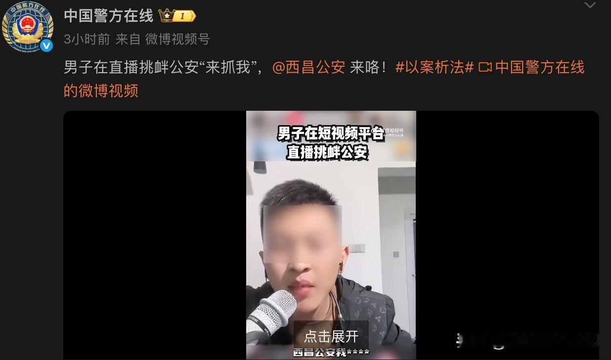 西昌一宝器公然直播挑衅警察叔叔,结果喜提银手镯一副,堪称求锤得锤活教材!就在最近,西昌一宝器男子因不满其朋友被抓,为了泄愤居然开直播飙脏话挑衅警察叔叔求带走!结果视频画风一转就转到警察叔叔那里,警察叔叔说“听说你一直在网上找我们,我们来了”。简单一句话,就道出了法律的威严。没过多久,这位宝器就对着镜头就老老实实认错了,简直是之前有多嚣张,现在就有多狼狈,法律底线不容践踏,践踏则要付出代价!对了,话说这家伙会被怎样处罚?求科普。
