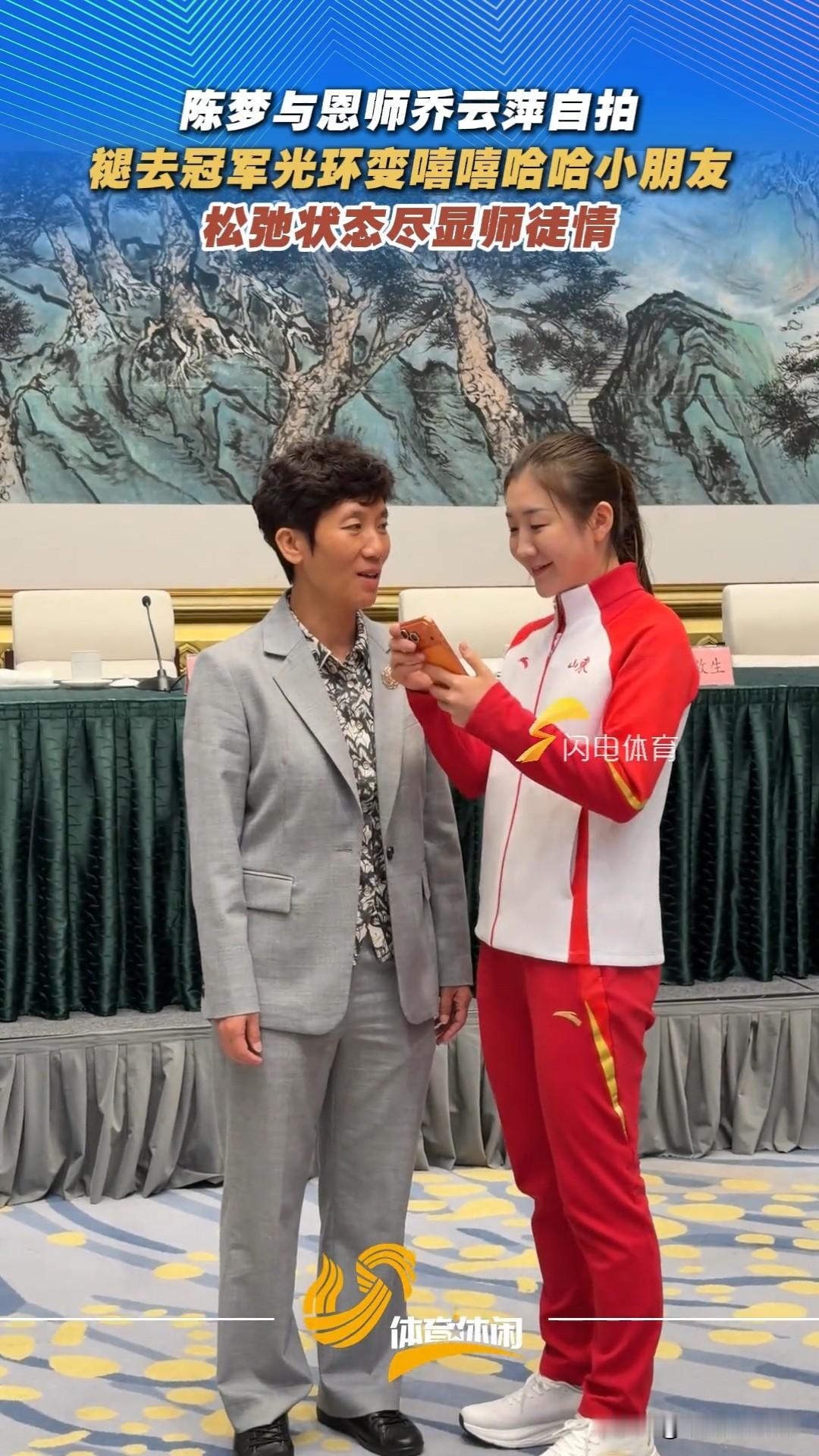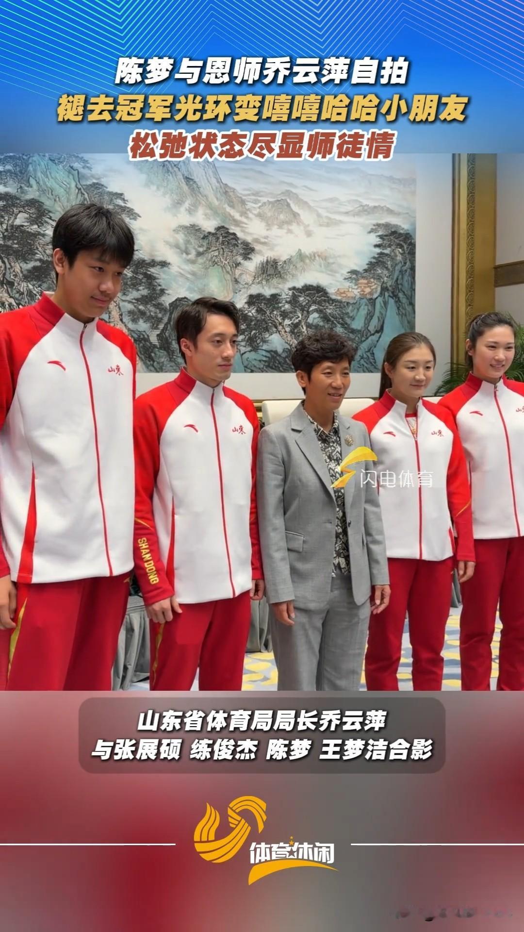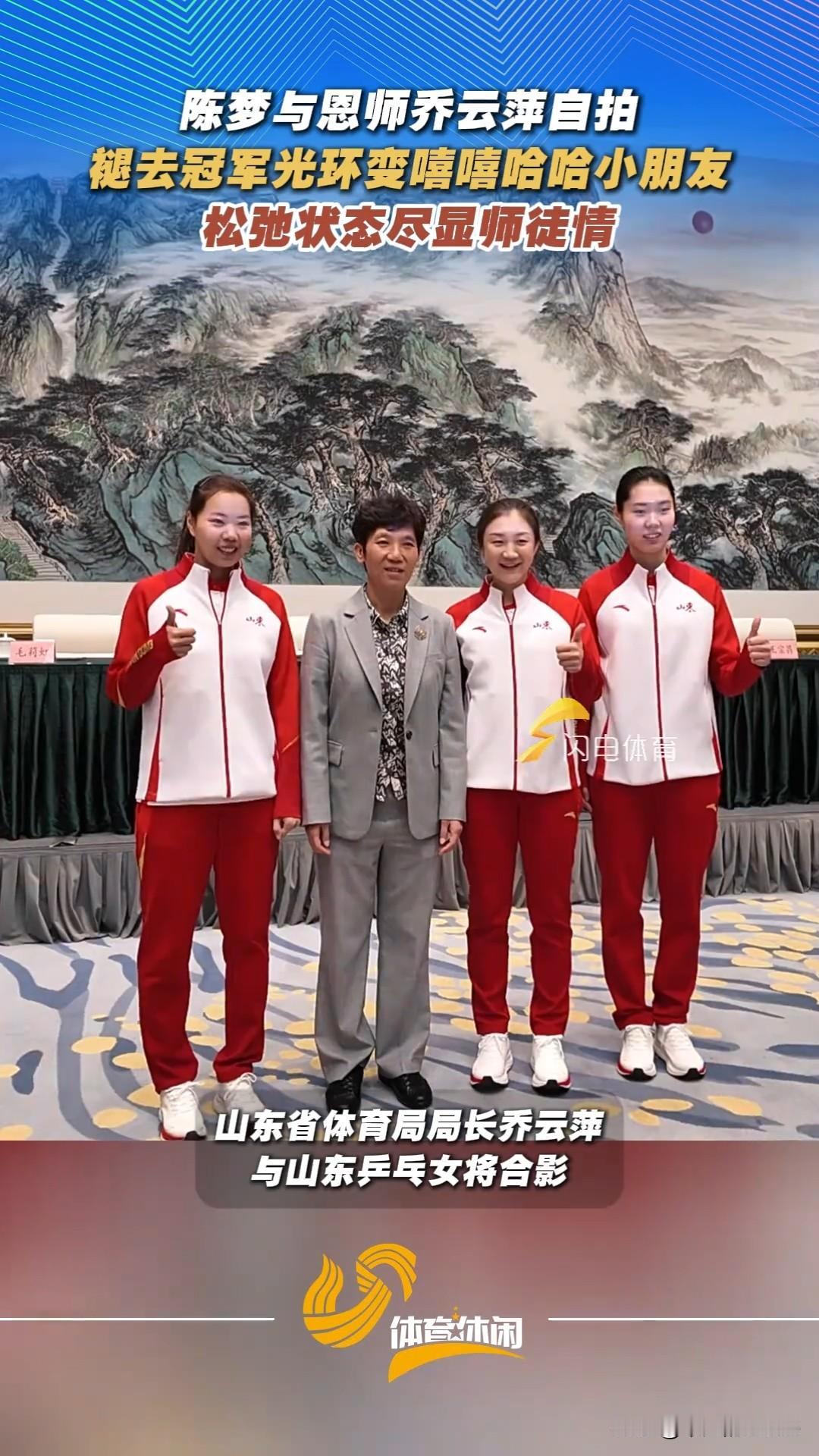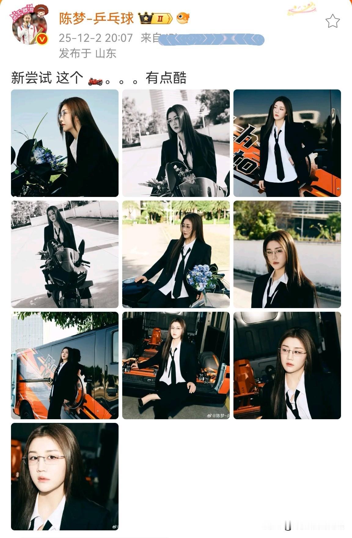 12月2日,山东省体育局召开十五运总结大会,陈梦、练俊杰、张展硕等知名运动员出席了该会议。 会后,山东省体育局局长乔云萍与陈梦、张展硕、练俊杰、王梦洁等运动员们合影留念。 在场的运动员中,只有陈梦敢拿出手机和乔云萍自拍,因为大梦是乔云萍的徒弟。 师徒两人拍照时,乔云萍用手理了一下头发,不知道她给大梦说了啥,陈梦听了以后,脸上笑开了花。 陈梦身后有恩师乔云萍,樊振东身后有伯乐王励勤,这或许就是他俩的底气所在。 今天,陈梦更新动态,并配文说道:“新尝试,这个摩托车有点酷。” 大梦发了10张照片,她一身黑西装穿搭,脸上戴着框架眼镜,看起来又美又飒,大家觉得呢?(图片来源于网络,侵删)