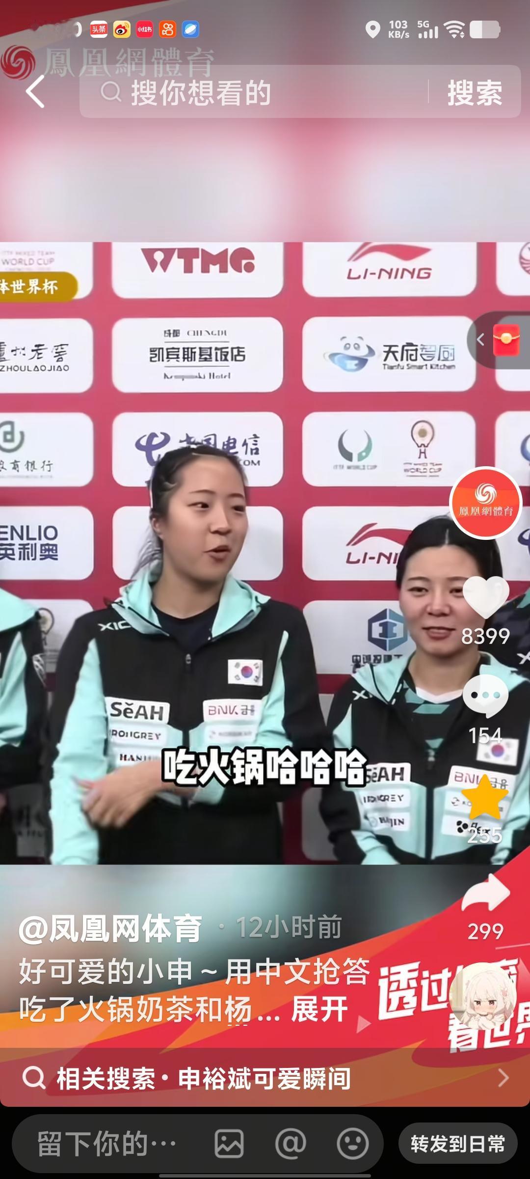 太可爱了!韩国申裕斌被问喜欢王楚钦还是林诗栋,为难后喊出大头,中文流利说爱火锅奶茶,奥运合影娇羞圈粉~ 韩国的申裕斌太可爱了。有人问他喜欢王楚琴还是林诗栋?他做了一个为难的表情。喊出了王楚钦。 接着又问他来成都都吃了什么?可爱的小姑娘,直接用中国话回答。 吃火锅,喝奶茶,喝杨枝甘露,他都非常喜欢。这姑娘。汉语进步神速。 也是大头的死忠粉。奥运会的时候和大头合影,满脸的娇羞。球迷都说简直就是在演我。 旁边的几个女孩子,中国话说的也很溜。嗯这小姑娘总是喜气洋洋的,真的很讨人喜欢。