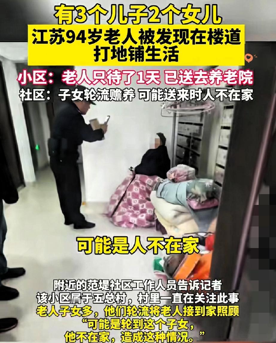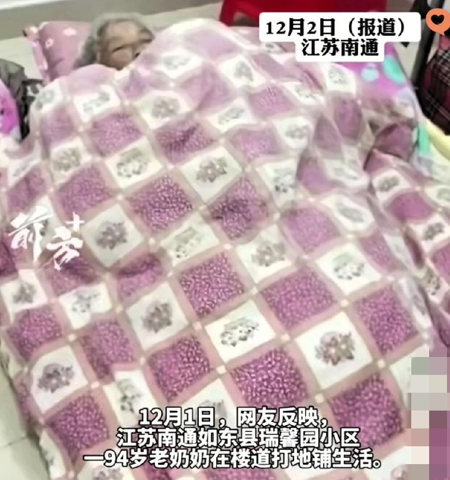 94岁老人被丢楼道打地铺,5个子女的赡养成笑话,社区回应更让人寒心! 12月1日南通如东的一则视频看得人心里发堵,九旬奶奶蜷缩在楼道地面的简易床铺上,身边堆着零散行李,寒风里就这么熬过一天。 明明有三个儿子两个女儿,却被以赡养纠纷为由丢在公共楼道,转头社区一句“可能送来时子女不在家”,简直把敷衍刻到了骨子里。 赡养从不是走流程的轮流交接,更不该是没人接手时就弃之不顾的甩包袱,五个子女凑不出一份安稳,反倒让九旬老人受冻遭罪,这份冷漠比楼道的寒风更刺骨。 好在老人最终被送进养老院,可这临时的安置,终究抵不过子女该尽的本分。 赡养老人从来不是选择题,而是为人子女的底线,那些长大路上被父母捧在手心的时光,难道都忘了吗? 你们觉得,轮流赡养真能替代真心陪伴吗?