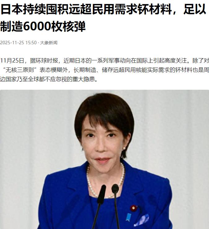 中美俄罕见意见一致:宁可此国从地球上消失,也绝不允许它拥有核武器。中俄经常联手反对美国霸权主义,但是有一件事,三国的意见却出奇的一致,那就是宁愿这个国家从地球上消失,也不能让它造出来核武器,这个国家到底是谁? 这个国家就是日本。日本早在1941年就憋着造核弹的坏心思,陆军鼓捣Ni-Go计划,海军搞F-Go计划,在东京、京都的实验室里吭哧吭哧提炼铀,还从德国偷偷摸材料,要不是那会儿资源不够、盟军又炸了他们的实验室,指不定二战结局都得变一变。 最离谱的是,嘴上喊着反核,背地里却疯狂囤核材料。2023年底光分离钚的库存就有44.5吨,这是什么概念?足够造几千枚核弹头,就这还不算完,青森县六所村的再处理厂还在一个劲地从核废料里抠钚,跟捡着宝贝似的。 最要命的是,日本的核燃料循环技术是真牛,嘴上说只用来搞民用核电,可明眼人都知道,只要他们想,几个月就能把这些技术转成军用,造核弹跟搭积木似的简单,周边国家能不捏把汗吗? 就说美国,明面上是这主儿的盟友,还拍胸脯给核保护伞,说要是有人揍它,美国就用核弹帮它报仇。 可美国心里跟明镜似的,它要的是一个听话的小弟,不是一个手握核按钮的“大爷”。 要是这主儿真有了核武器,首先摆脱的就是美国的控制,说不定还会反过来要挟美国,毕竟五角大楼早推演过,日本拥核后甚至可能突袭驻日美军基地,这种养虎为患的事儿,美国才不干。 所以别看美国嘴上喊着保护,私底下却年年派人去查这主儿的钚库存,生怕它偷偷搞小动作。 而看中国,那更是门儿清,日本当年侵略亚洲的账还没算清,连历史教科书都敢改,要是再握上核武器,那不就是在家门口摆了颗定时炸弹? 就拿2023年它排福岛核污水那事儿来说,为了自己省事,把全球海洋当垃圾桶,连核废料都处理得这么自私,谁能信它能负责任地管核武器? 光是这一点,中国就不可能松口——毕竟一个连历史都不敢正视的国家,手握核大棒,对周边的威胁可不是一星半点。 俄罗斯的态度更直接,毕竟还有北方四岛的领土争端搁那儿。 日本要是有了核武器,怕是立马就敢拿核讹诈逼俄罗斯让岛,更别说它的F-35战机要是装上核弹,直接就能覆盖俄罗斯远东的军事基地和能源重地,这可是俄罗斯的命根子,能忍才怪。 所以俄军近几年总在千岛群岛部署导弹,派核潜艇在日本海溜达,说白了就是明晃晃的威慑:敢碰核武器试试? 说白了,中美俄仨大国虽然各有各的算盘,但在这事上的核心利益是一致的:核武器是终极威慑,谁都不想再多一个能摁核按钮的主儿。 日本要是真拥核,东亚的军备竞赛得直接炸锅,美国的亚太霸权会乱套,中国的安全环境会被严重威胁,俄罗斯的远东利益也得打水漂。 所以哪怕平时吵得再凶,在掐死这主儿的核野心这件事上,仨大国的意见出奇地一致——宁可把这主儿摁得死死的,也绝不让它碰核武器的边儿,毕竟谁都不想给自己找这么个核麻烦。
