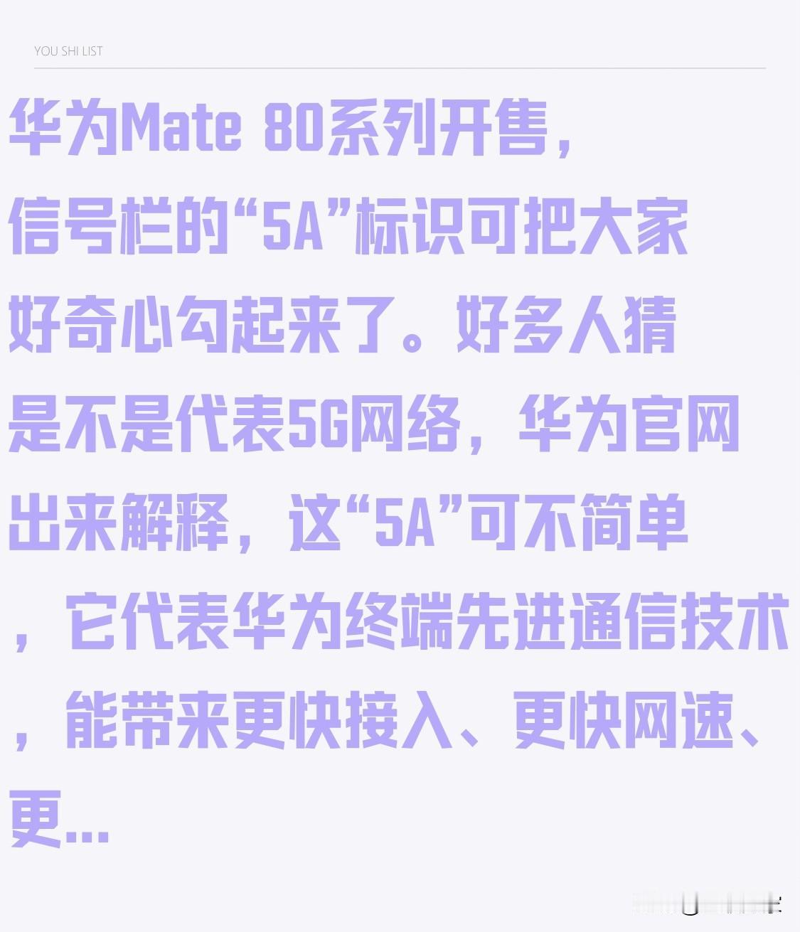 华为Mate 80系列开售,信号栏的“5A”标识可把大家好奇心勾起来了。好多人猜是不是代表5G网络,华为官网出来解释,这“5A”可不简单,它代表华为终端先进通信技术,能带来更快接入、更快网速、更低时延、更稳连接的综合通信体验。 要注意哈,5A既不等同于5G - A,也不是5.5G,而且不涉及额外资费,也没单独开关,系统默认支持。目前华为Mate 80系列、Mate X7系列率先支持。不得不说,华为在通信技术上又玩出新花样,期待它后续还能带来啥惊喜! mate80 mate 80 华为80长焦 华为ura80 华为80por mate80 mate 80 华为80pro 华为ura80 华为80por 华为p80u 华为5G