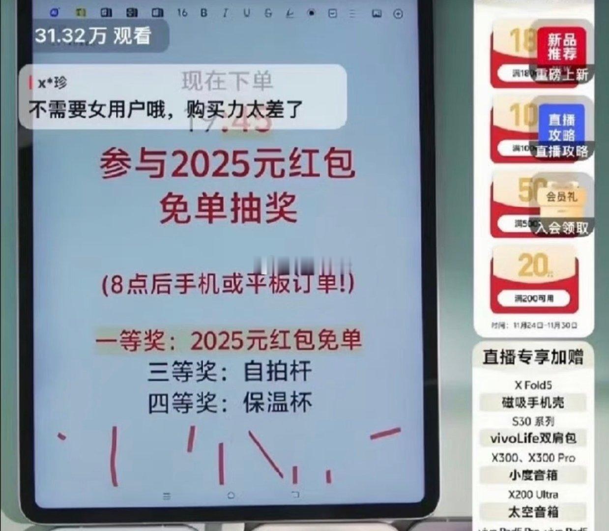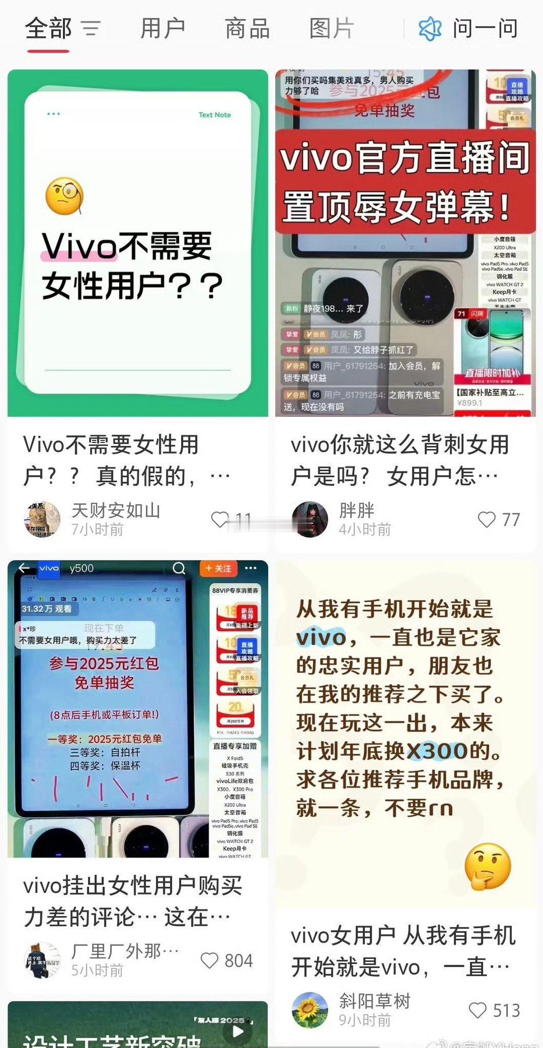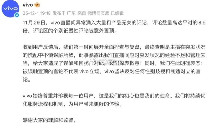 近日,vivo直播间内将“用你们买吗集美戏真多,男人购买力够了哈”“不需要女用户哦,购买力太差了”等评论置顶。此举被质疑“歧视女性群体”,小红书出现大量抵制vivo的内容,随后官方道歉:系主播慌乱中误触。