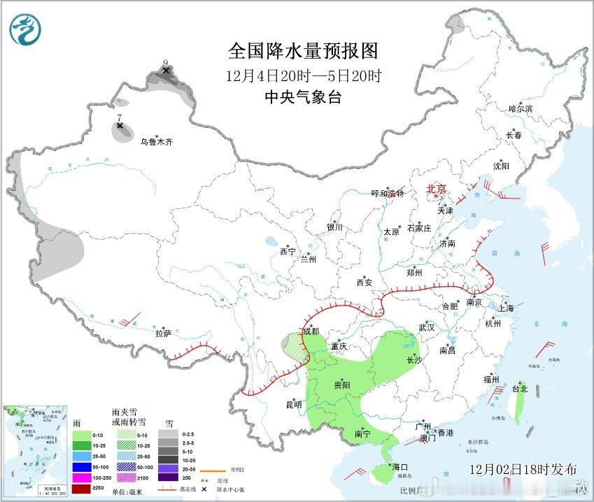 【降水】昨晚到今天,广东海南的降雨增多,两省站点包揽24小时降水榜前10。其中广东信宜出现29.9毫米大雨,在12月不多见,可以排到12月单日降水量第9。另外山东多地今天出现冷流降雪,寿光、青州、龙口、福山出现了中雪,龙口14时积雪5厘米。今晚到明天,冷空气继续南下,冷暖空气交汇,导致南方有较大范围的降雨,总体强度较弱,但在海南岛东部,水汽相对充沛,而且还有一些对流能量,因此有可能出现小范围的大雨-暴雨并伴随雷电,但降雨破纪录的可能较小(琼海、万宁12月有过大暴雨)。4日以后,干冷空气掌控中东部,降水向西南地区收缩。在4-5日以及7日以及9日前后,西南一带,因为南支槽东移,还有些弱降水。另外12月9日以后,新疆的降雪可能明显发展。由于后期冷空气的强度、影响新疆的时间有变数,这个预报不定论,后期关注临近报的修订。