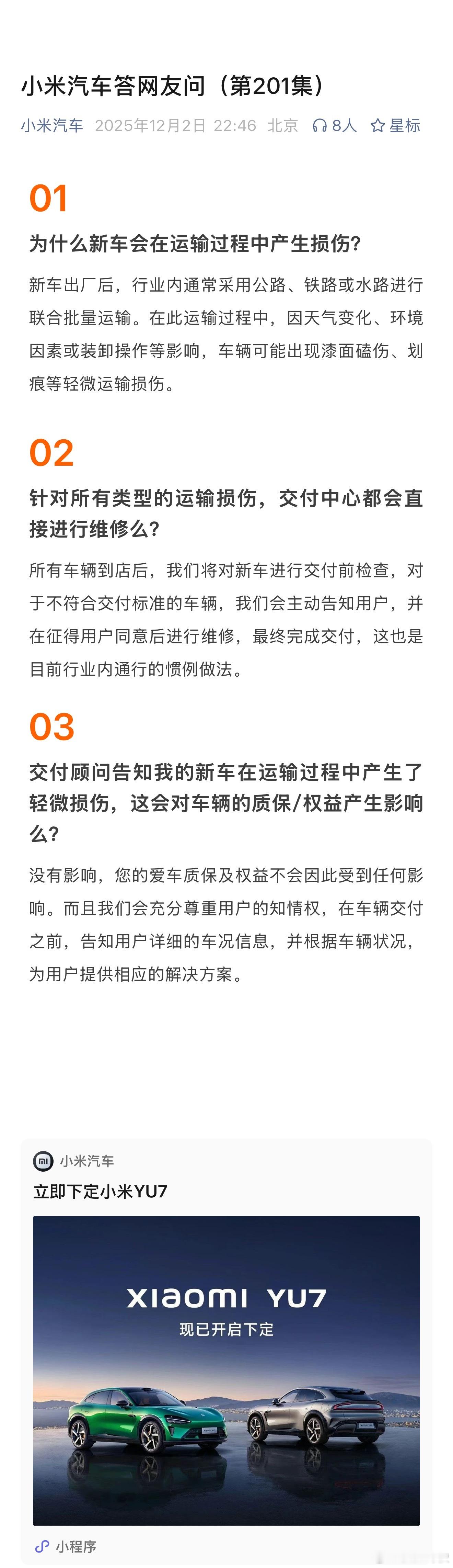 小米YU7运损车拒退定金前脚刚出运损事件后脚官方公众号出一个运损问答(p2)问:针对所有类型的运输损伤,交付中心都会直接进行维修么?答:新车到店会先做交付前检查,不符合交付标准的,告知用户并征得同意后维修,维修完成再交付,这是行业惯例。这种情况你们觉得该退定金吗?