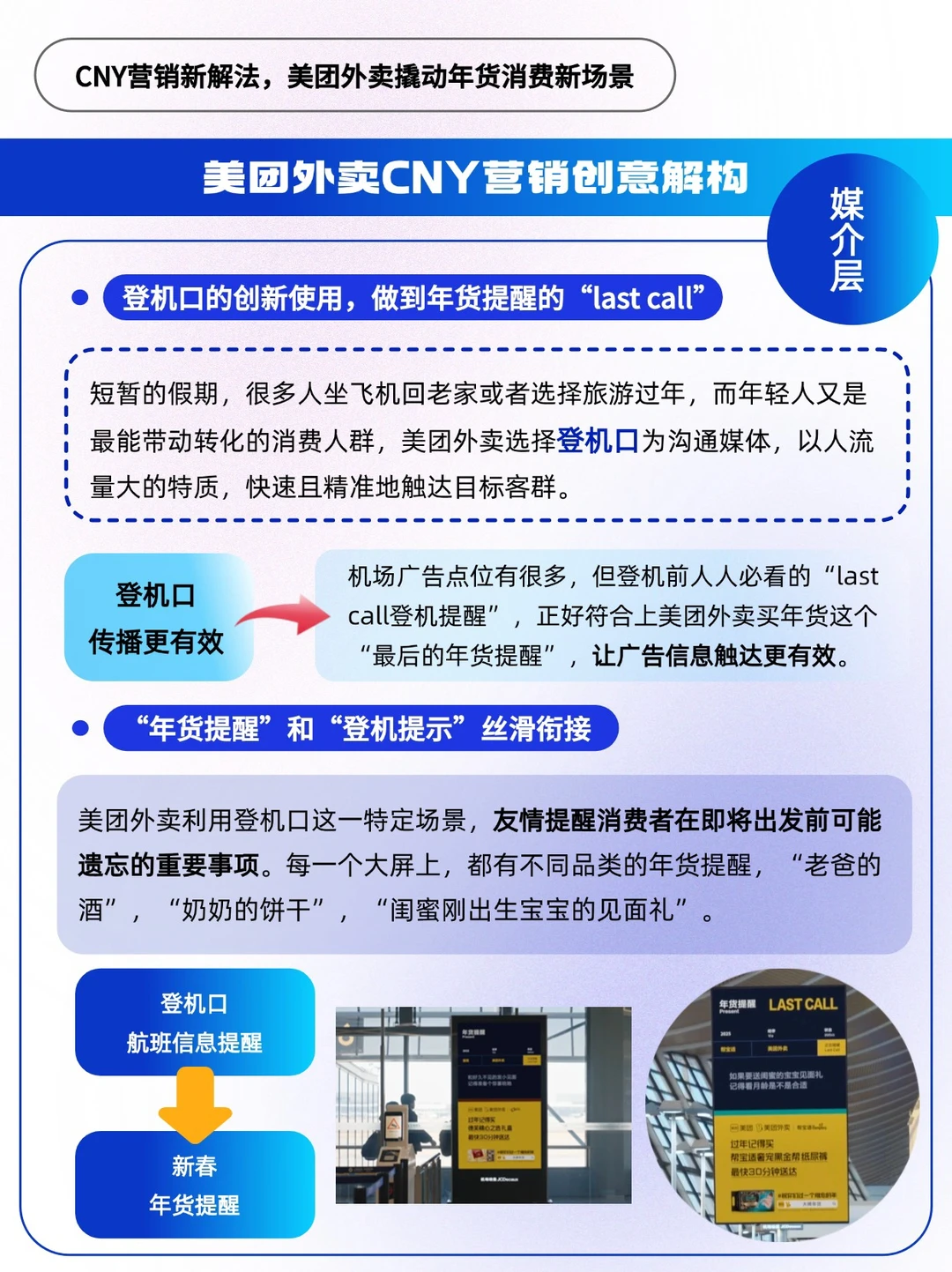 机场广告点位有很多,但登机前人人必看的“last call登机提醒”,正好符合上美团外卖买年货这个“最后的年货提醒”,让广告信息触达更有效✈️