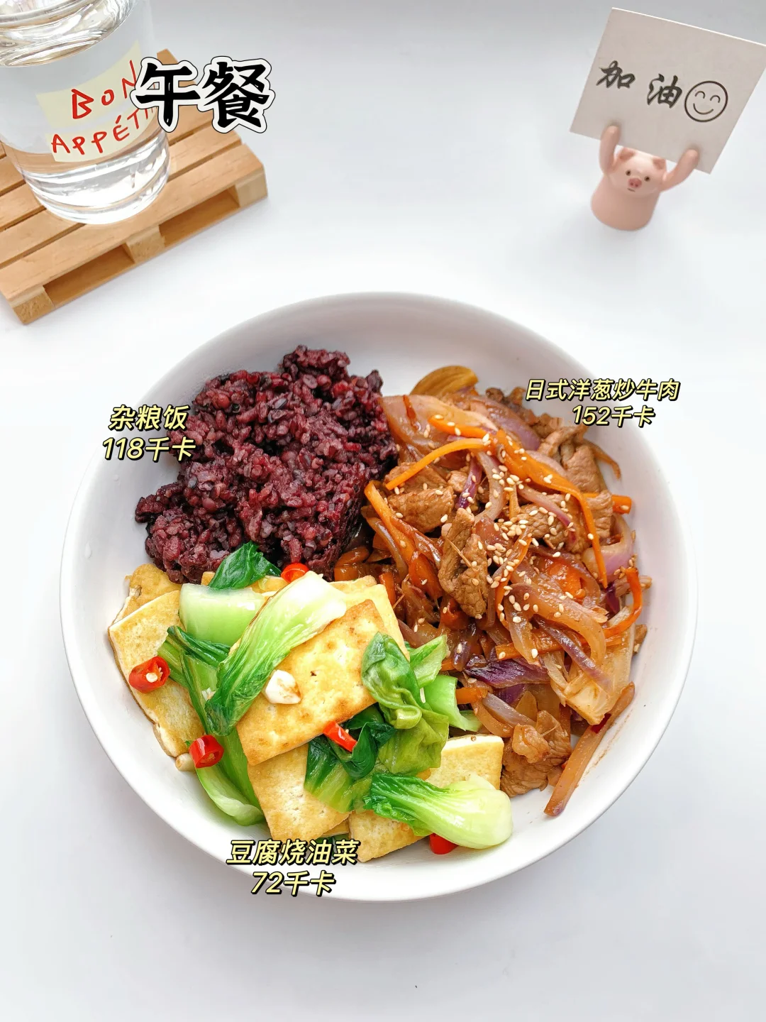 一日三餐🥣 ✅早餐:黑咖啡,水煮玉米,煮西蓝花,煎蛋🍳 ✅午餐:杂粮饭,豆腐烧油菜,日式洋葱炒牛肉 [向右R]酱汁:一勺生抽,一勺蚝油,半勺老抽,半勺黑胡椒粉,半勺白糖,三勺清水 ✅晚餐:荷包蛋焖面 ♨️喜欢请看上图,附有做法,附热量表~ [偷笑R]欢迎进入我的主页收藏我的食谱,分享我的生活化减脂餐~