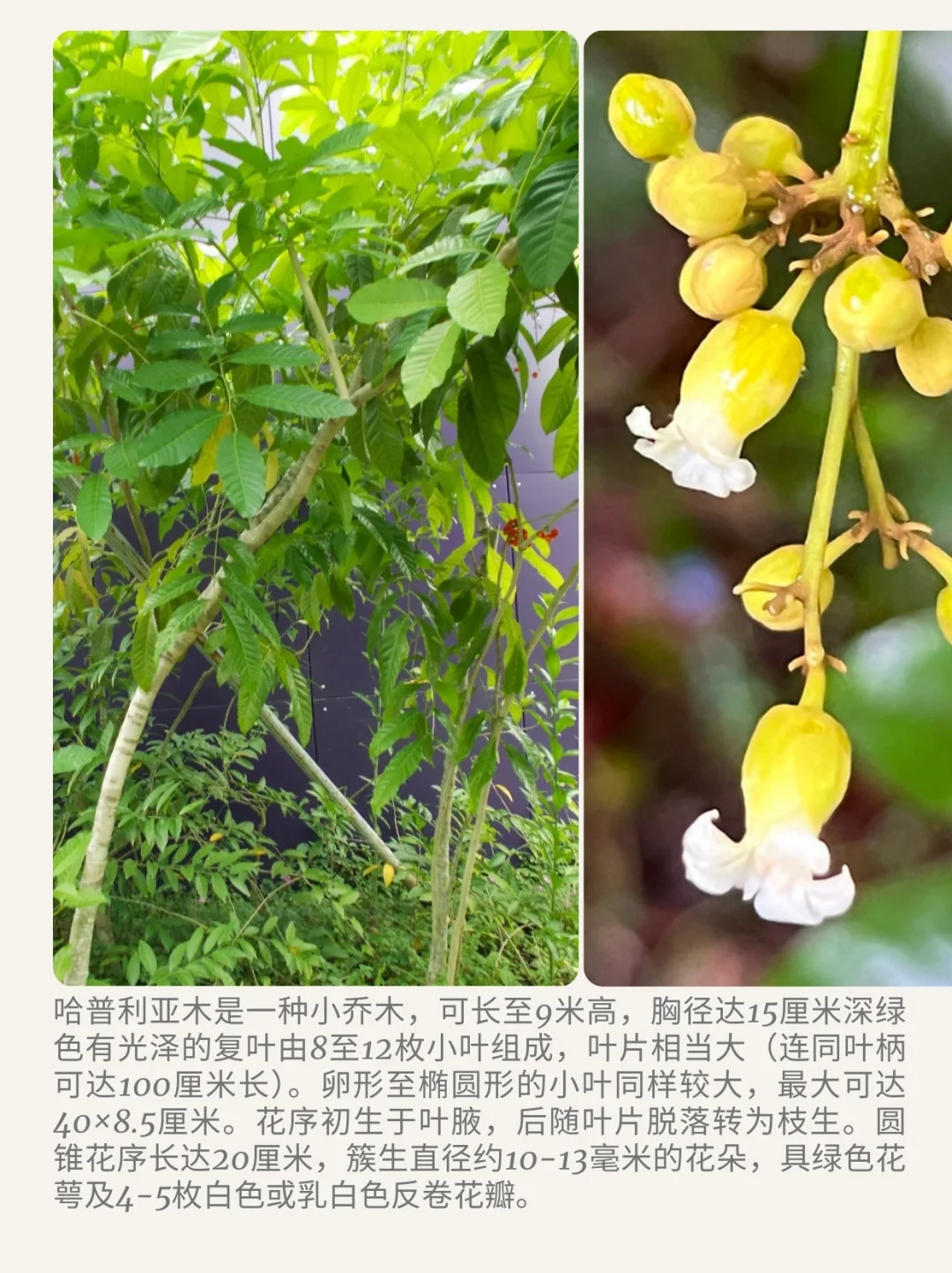 哈普利亚木是一种小乔木,可长至9米高,胸径达15厘米深绿色有光泽的复叶由8至12枚小叶组成,叶片相当大(连同叶柄可达100厘米长)。卵形至椭圆形的小叶同样较大,最大可达40×8.5厘米。花序初生于叶腋,后随叶片脱落转为枝生。圆锥花序长达20厘米,簇生直径约10-13毫米的花朵,具绿色花萼及4-5枚白色或乳白色反卷花瓣。