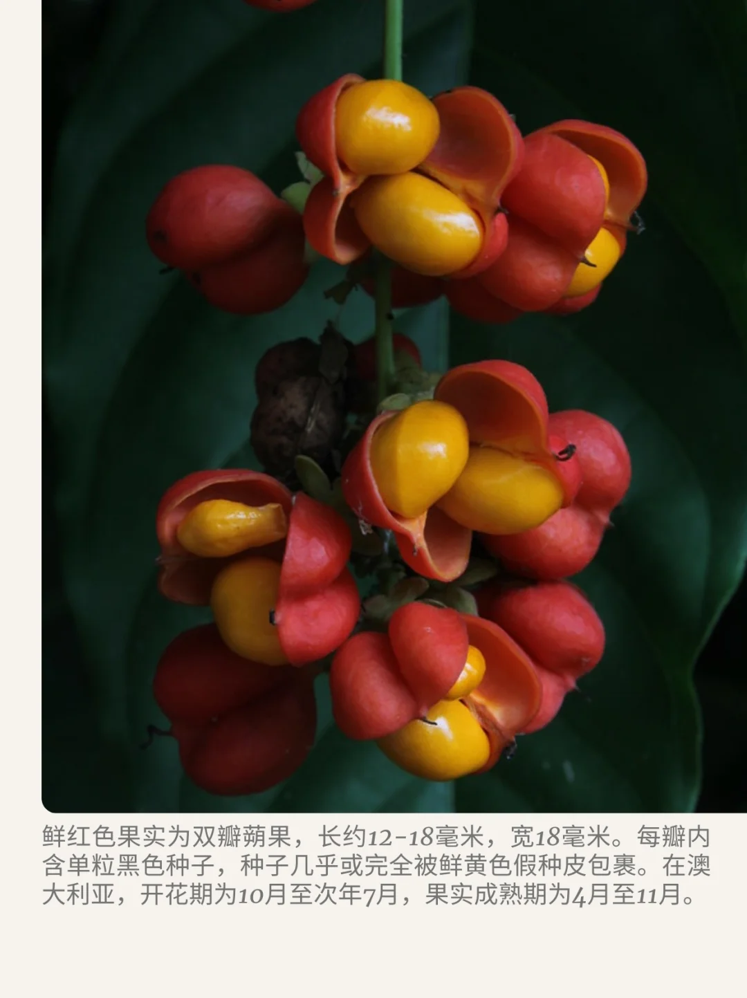 鲜红色果实为双瓣蒴果,长约12-18毫米,宽18毫米。每瓣内含单粒黑色种子,种子几乎或完全被鲜黄色假种皮包裹。在澳大利亚,开花期为10月至次年7月,果实成熟期为4月至11月。
