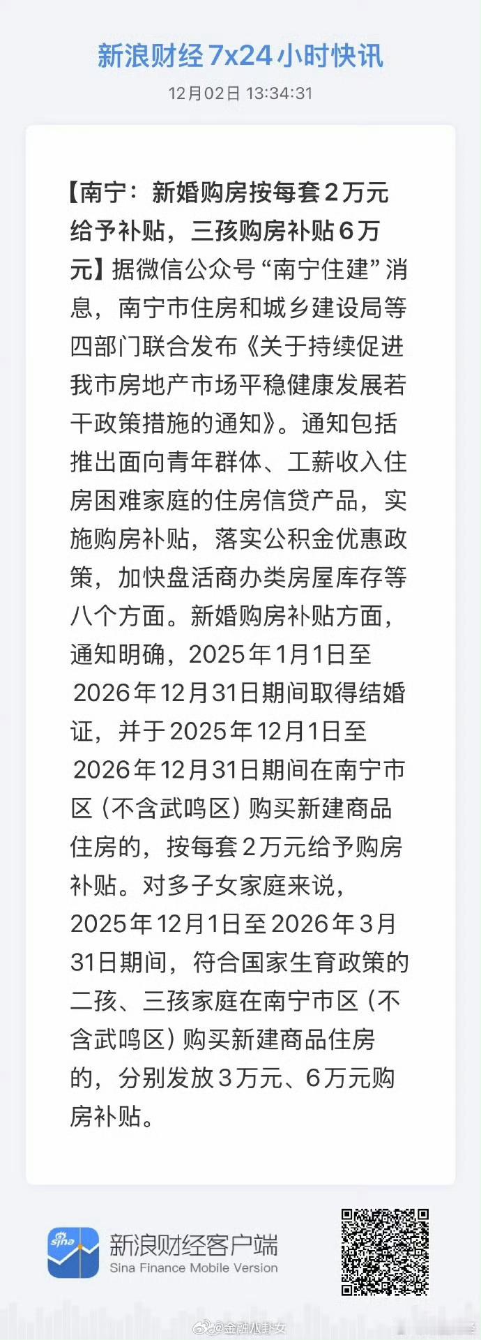 南宁:新婚购房按每套2万元给予补贴,三孩购房补贴6万元