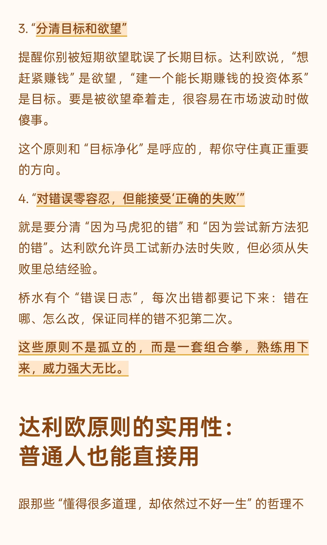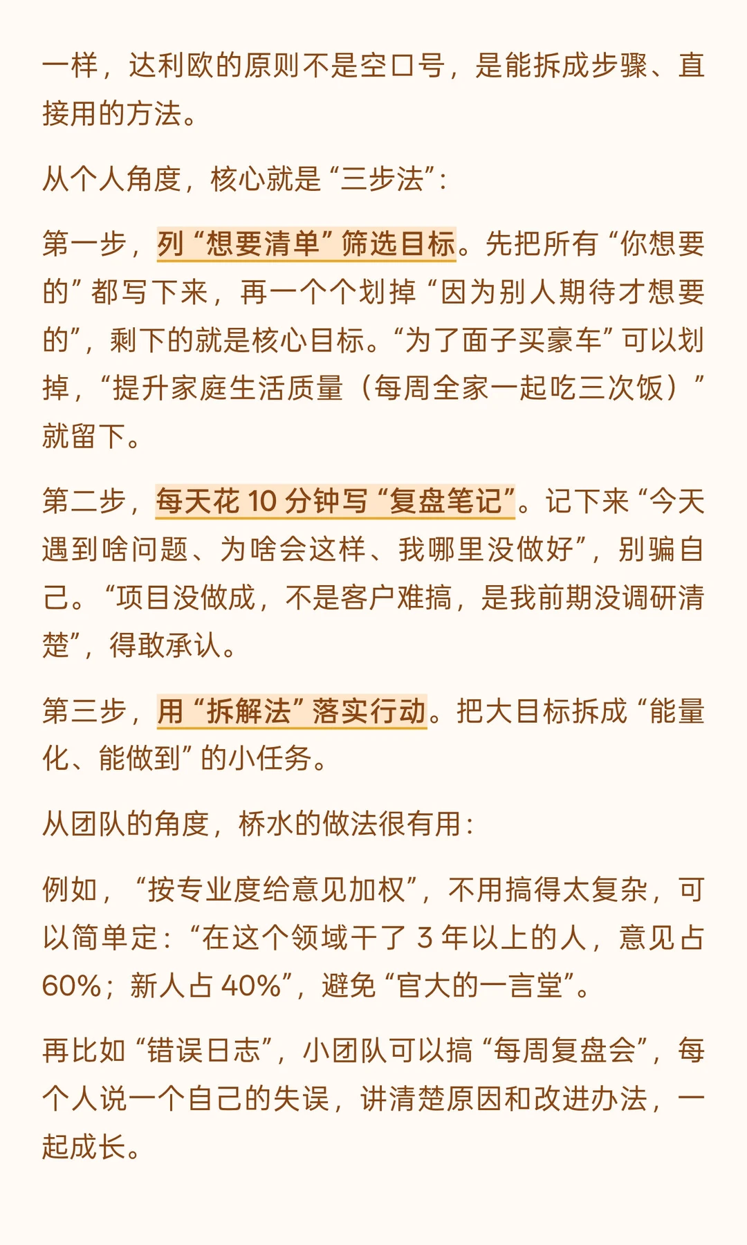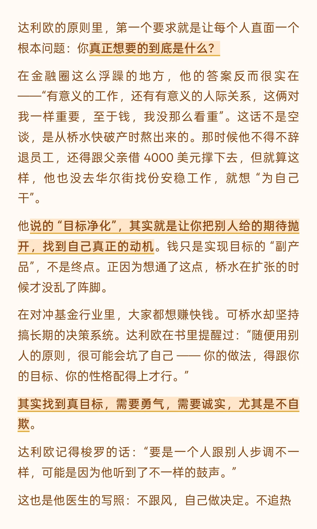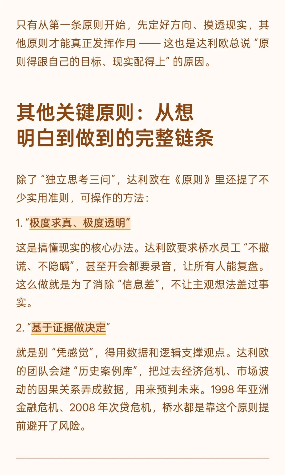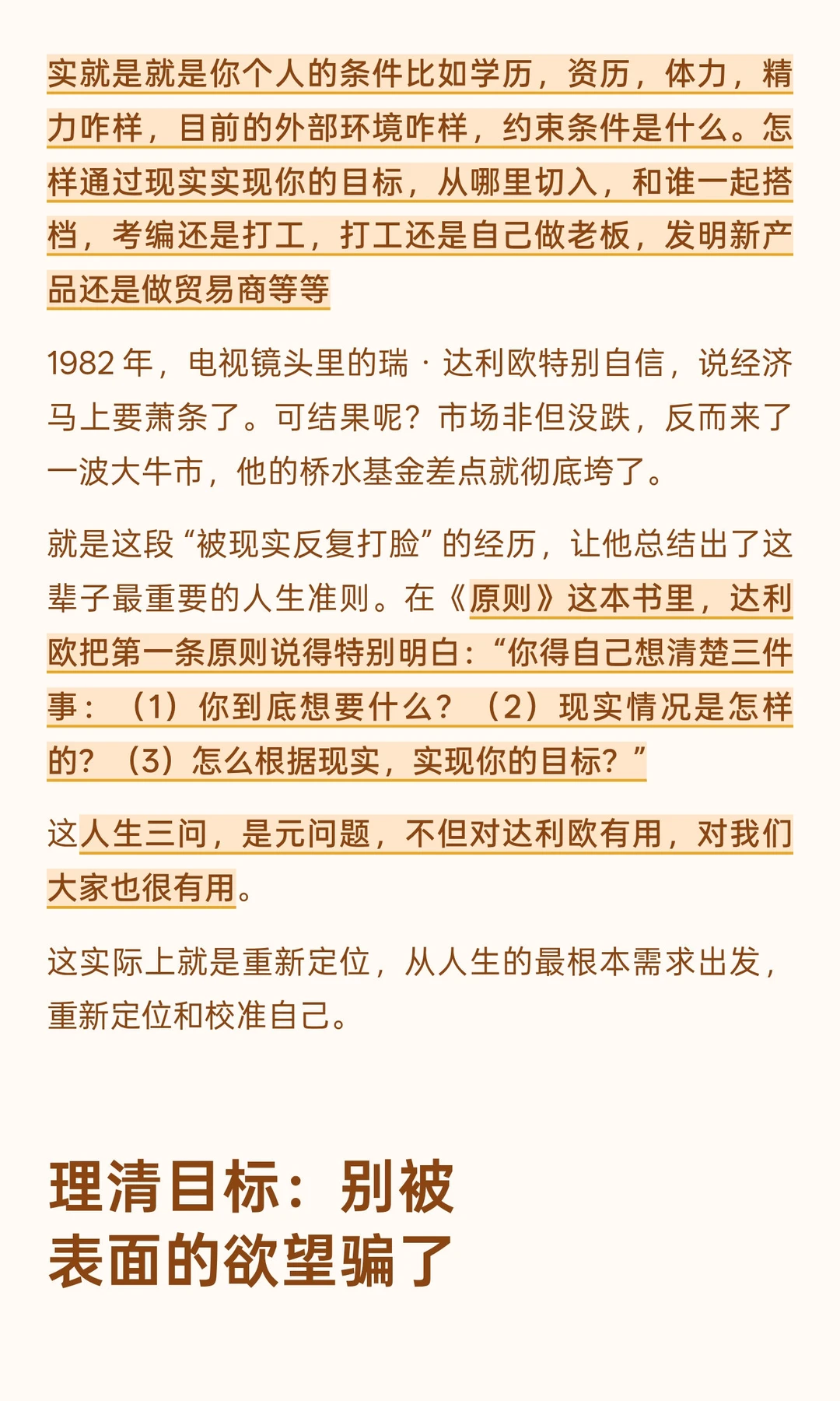 就是这段 “被现实反复打脸” 的经历,让他总结出了这辈子最重要的人生准则。在《原则》这本书里,达利欧把第一条原则说得特别明白:“你得自己想清楚三件事:(1)你到底想要什么?(2)现实情况是怎样的?(3)怎么根据现实,实现你的目标?”
