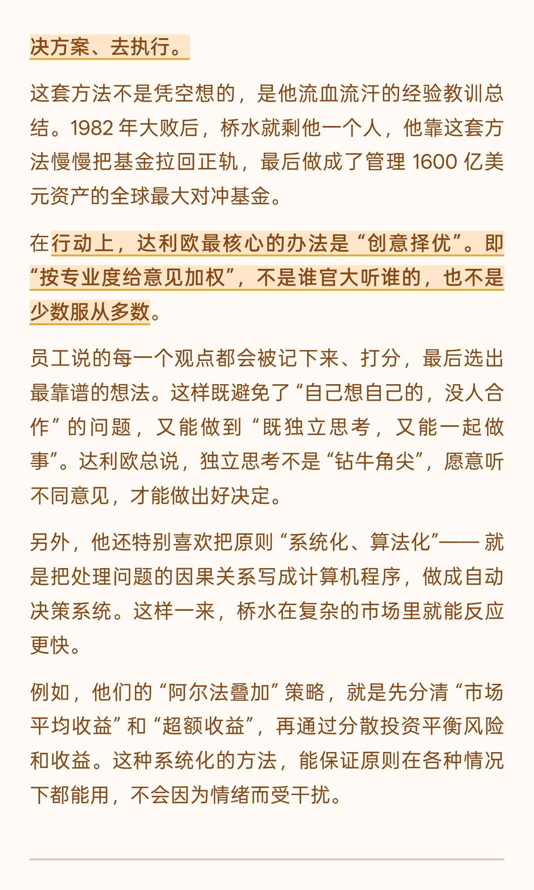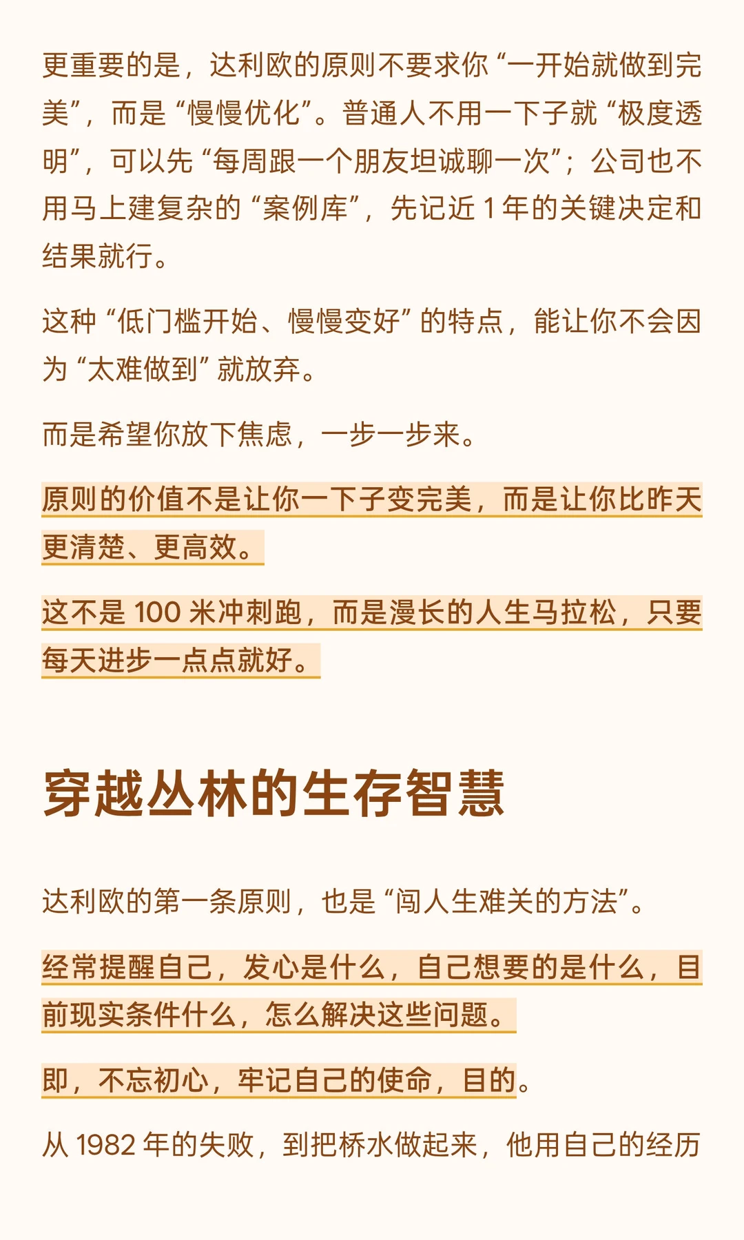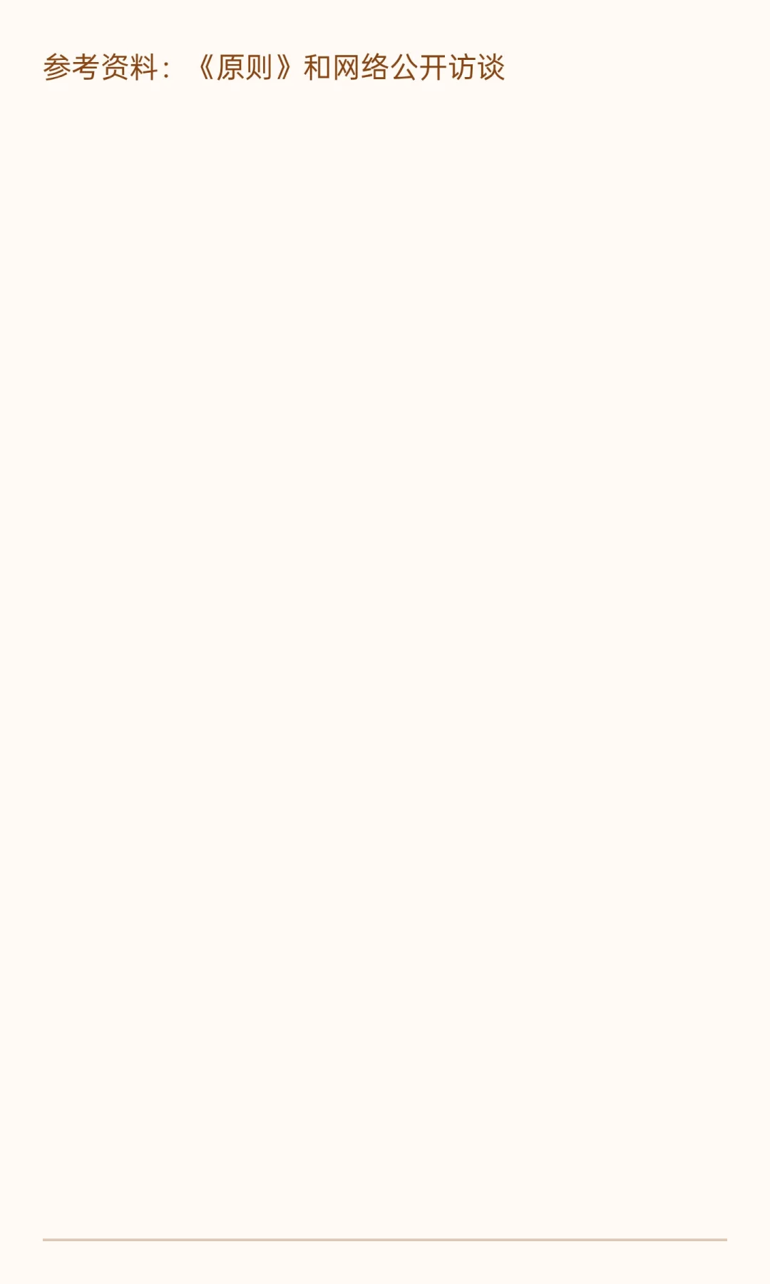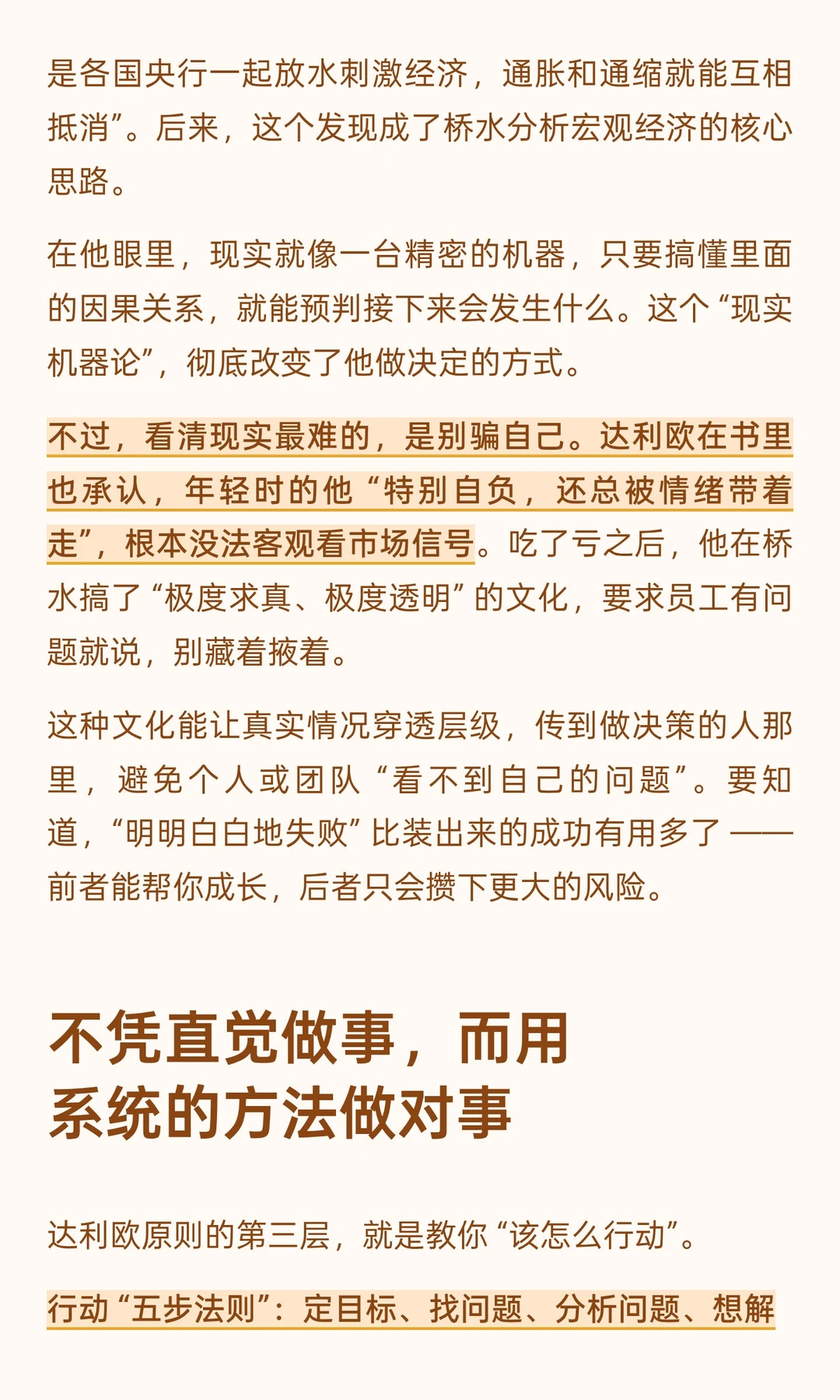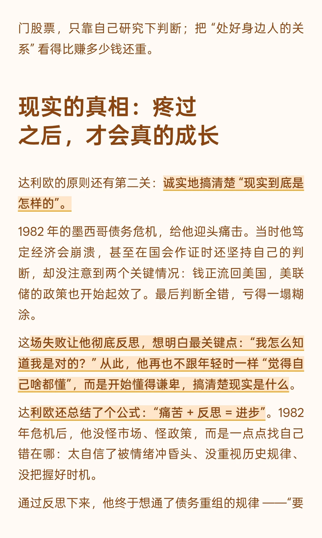 就是这段 “被现实反复打脸” 的经历,让他总结出了这辈子最重要的人生准则。在《原则》这本书里,达利欧把第一条原则说得特别明白:“你得自己想清楚三件事:(1)你到底想要什么?(2)现实情况是怎样的?(3)怎么根据现实,实现你的目标?”