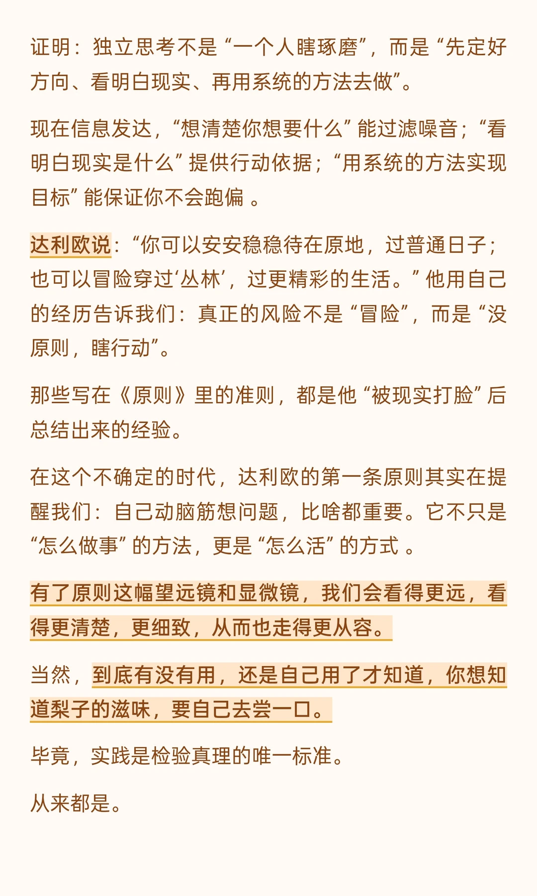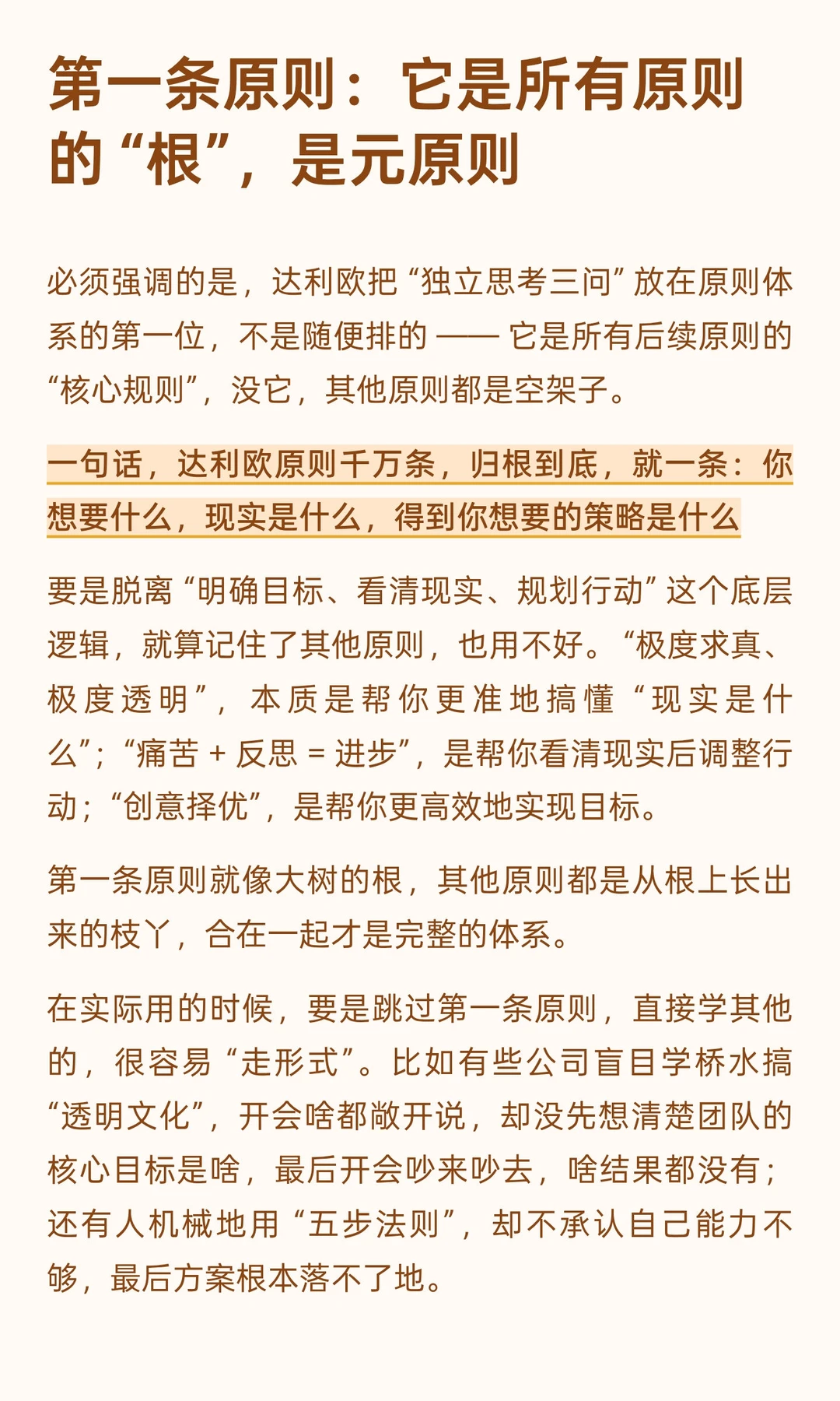 达利欧的原则千万条,核心原则就一条:你想要什么,现实是什么,根据现实实现你想要什么的策略是什么。根据这一道理,就敢走独立思考,走自己路,实现人生目标。
