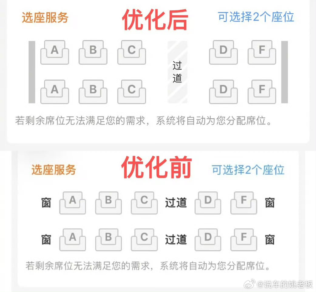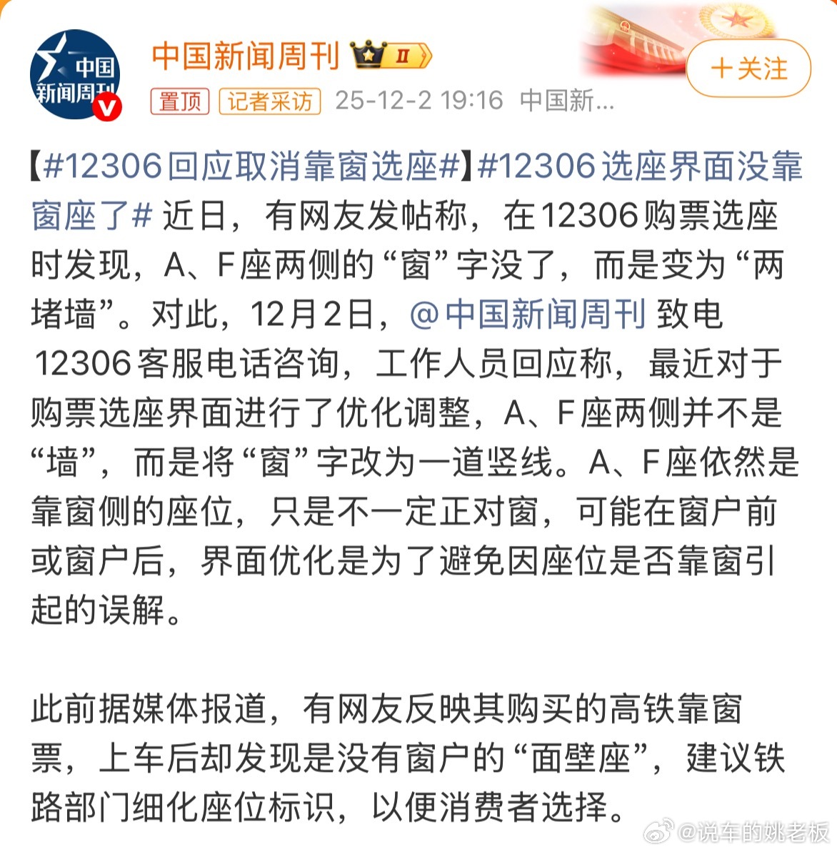 12306回应取消靠窗选座不是真取消,是界面大优化啦,变得更加严谨。原来A/F座旁的“窗”字换成竖线,客服说座位还是靠窗侧,但未必正对窗户,因为高铁上有些A/F座位旁边是墙不是窗,这波改动你觉得合理吗?