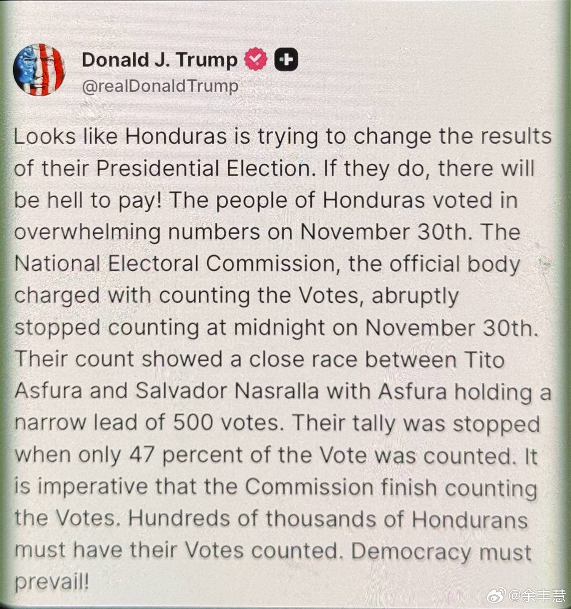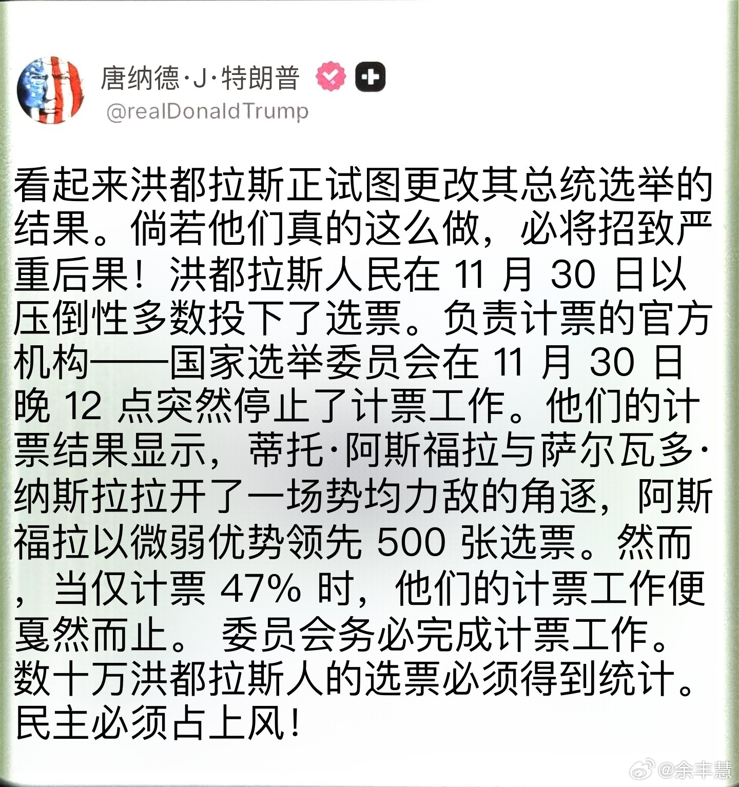 突发消息:特朗普总统公开抨击洪都拉斯举行“舞弊选举”,此前他已表态支持 Tito Asfura特朗普态度强硬,毫无妥协:“看来洪都拉斯正试图篡改其总统选举结果。若他们真这么做,必将付出惨痛代价!”他将情况阐述得十分清楚:11月30日,洪都拉斯民众大规模参与投票,但国家选举委员会在午夜突然停止计票,此时仅完成47%的选票统计。而当时,Tito Asfura 还以500票的优势领先。随后,所有计票工作“暂停”。特朗普的要求很简单:计票,把所有选票都算上。数十万洪都拉斯民众的声音,理应被听见。民主可没工夫喝杯咖啡歇着。(说明:“put on blast”为口语化表达,结合语境译为“公开抨击”以体现强烈态度;“HELL TO PAY”是惯用短语,译作“付出惨痛代价”更符合中文表达习惯,同时保留原文的警告语气。)