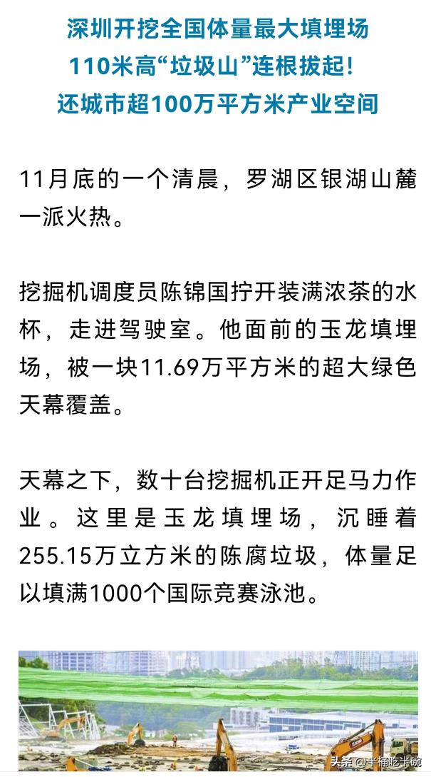中国的垃圾看来真的不够烧了 深圳2024年启动把全国最大的垃圾山挖了,在罗湖区的银湖山脚下,高度竟然有110米高,总体积高达255.15万立方米。 说白了,以前愁垃圾太多埋不完,现在愁垃圾太少不够烧,深圳挖开 110 米高的垃圾山当 “燃料”,这波操作直接把垃圾从城市包袱变成了香饽饽。 你敢信吗?深圳罗湖区银湖山脚下藏着座 “垃圾珠峰”,110 米的高度快赶上四十层楼,255.15 万立方米的体量能填满 1000 个标准泳池,从 1983 年用到 2005 年封场,妥妥的城市 “历史遗留病灶”。 可 2024 年一开工,挖掘机天天挖出 6000 立方米陈腐垃圾,筛出的可燃物直接送进焚烧厂,这哪是清垃圾,分明是挖 “宝藏”。 这事搁十几年前想都不敢想,早年垃圾焚烧就是个麻烦制造机,炉温上不去,烧不透的垃圾会冒出二噁英,这东西毒性极强,欧洲早年就吃过大亏,不少地区因为焚烧技术落后,土壤和水源都遭了污染,留下一堆环境难题。 那时候扔垃圾都带着负罪感,生怕自己随手一丢就成了污染源头,老外还总拿垃圾分类说事,好像我们处理垃圾全凭蛮干。 谁能想到技术一发力,局面彻底反转,现在的焚烧炉早就不是当年的 “小作坊”,炉膛温度直奔 1000℃以上,垃圾进去先经历干燥、热解,再充分燃烧,最后燃尽,整个过程把大分子有机物拆解得明明白白,最终变成二氧化碳和水,连剧毒的二噁英都能被彻底分解。 深圳能源生态园的设备更讲究,烟气得在 850℃以上停留至少 2 秒,再经过脱硝、脱酸、活性炭吸附等好几道净化,排放指标比欧盟标准还严。 更有意思的是,以前盼着 “一烧了之”,现在烧都烧不够了,全国垃圾焚烧厂平均负荷率才 60%,40% 的产能都闲着,西安 5 座焚烧厂一天能烧 1.27 万吨,实际收不上来那么多;华东还有焚烧厂为抢垃圾,把处理费从 80 元 / 吨压到 50 元,简直是亏本赚吆喝。 难怪深圳要挖旧垃圾山,单是玉龙填埋场筛出的 33 万吨可燃物,就能发 1 亿度电,够 2.6 万户家庭用一年,这哪是垃圾,分明是固态 “天然气”。 要知道现在挖垃圾可比以前精细多了,整个填埋场盖着 280 米跨度的绿色天幕,雾炮机随时降尘,还有注气井给垃圾堆 “通风换气”,防止产生甲烷和臭味。 挖出来的垃圾先筛分,金属玻璃挑出来回收,可燃物送焚烧厂,残渣还能做环保砖,连轮胎上的泥都得冲干净才让上路,完全不是印象中脏乱差的样子。 老外当年的指责现在看挺讽刺,我们不仅把垃圾烧得干净,还烧出了能源短缺的 “幸福烦恼”,这背后根本不是什么 “一烧了之” 的偷懒,而是从炉温控制到尾气净化,一整套技术体系的升级换代,把以前的环境难题变成了能源收益。 以上只是个人看法,毕竟从 “垃圾围城” 到 “垃圾不够烧” 的转变实在惊人,你觉得这种靠技术盘活垃圾的模式,能在更多城市推广开吗?欢迎在评论区聊聊你的想法。