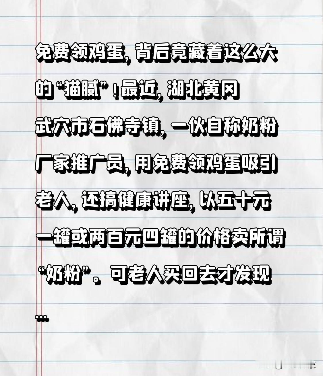 免费领鸡蛋,背后竟藏着这么大的“猫腻”!最近,湖北黄冈武穴市石佛寺镇,一伙自称奶粉厂家推广员,用免费领鸡蛋吸引老人,还搞健康讲座,以五十元一罐或两百元四罐的价格卖所谓“奶粉”。可老人买回去才发现,宣传的奶粉其实是蛋白粉,而这产品零售价才十几元一罐,推销人员根本不是厂商员工,就是网上进货赚差价,35名老人被骗12000余元。好在民警给力,让骗子退还了款项。 这骗局真是防不胜防,老人们爱占小便宜就容易中招。大家说说,生活中还见过哪些类似的免费领东西骗局?该怎么提醒老人远离这些陷阱呢? 老人鸡蛋骗局 免费送的骗局 消费者骗局 免费鸡蛋陷阱 领鸡蛋送酒骗局 鸡蛋一元领 免费宣传骗局