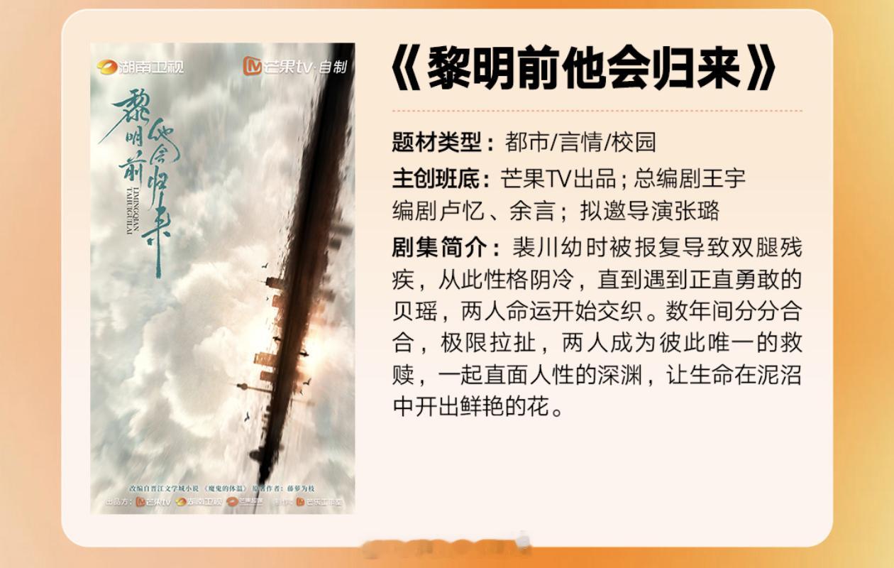 🥭《黎明前他会归来》12月25日前后开机领衔主演:毕雯珺、张淼怡、赵柯淳、柯颖
