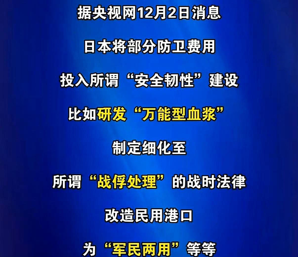 快讯!快讯! 日本居然打着“安全韧性”的幌子在偷偷备战! 别被“万能型血浆”“民用港口改造”的说法骗了,这些根本不是民生建设,而是实打实的战时准备。研发不用配型的血浆是为了提升战场救治效率,细化“战俘处理”法律是预设战争场景,民用港口改军民两用就是为了快速投送兵力。 专家都点透了,日本就是把“台海有事”当真,在做周密的实战准备。防卫费13年连涨,还在冲绳部署导弹,现在又搞这些细节筹备,“专守防卫”早成了空话。 所谓的“安全”,本质是挑动地区紧张的借口。这种步步紧逼的扩武操作,只会让周边更警惕。 你觉得日本这些动作会加剧地区局势吗?该如何警惕这种隐性备战?