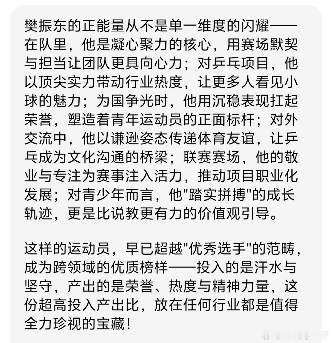 樊振东是多维度正能量标杆,超高投入产出比,这样的人才在哪个领域都是值得珍视的核心力量!