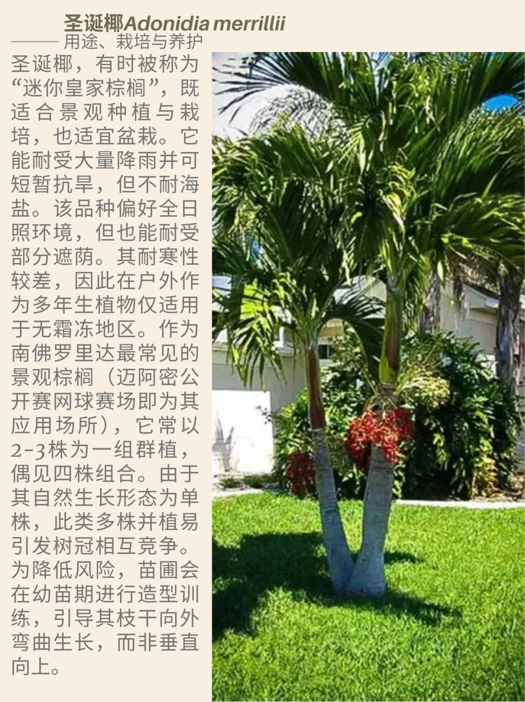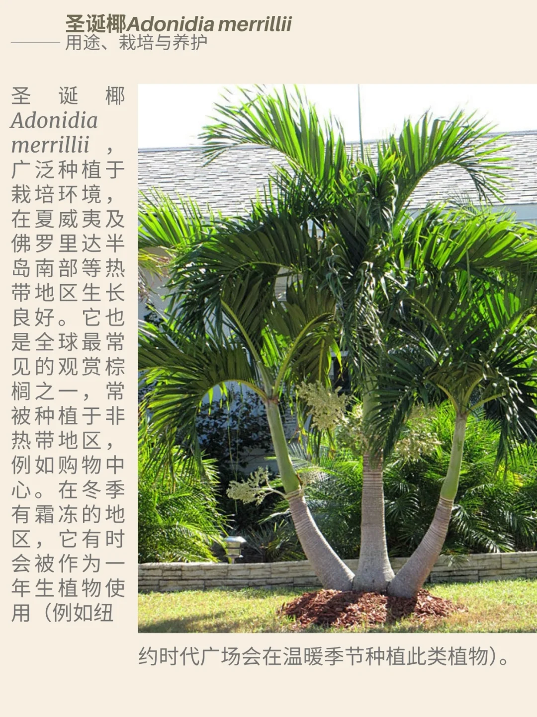 圣诞椰Adonidia merrillii,广泛种植于栽培环境,在夏威夷及佛罗里达半岛南部等热带地区生长良好。它也是全球最常见的观赏棕榈之一,常被种植于非热带地区,例如购物中心。在冬季有霜冻的地区,它有时会被作为一年生植物使用(例如纽约时代广场会在温暖季节种植此类植物)。