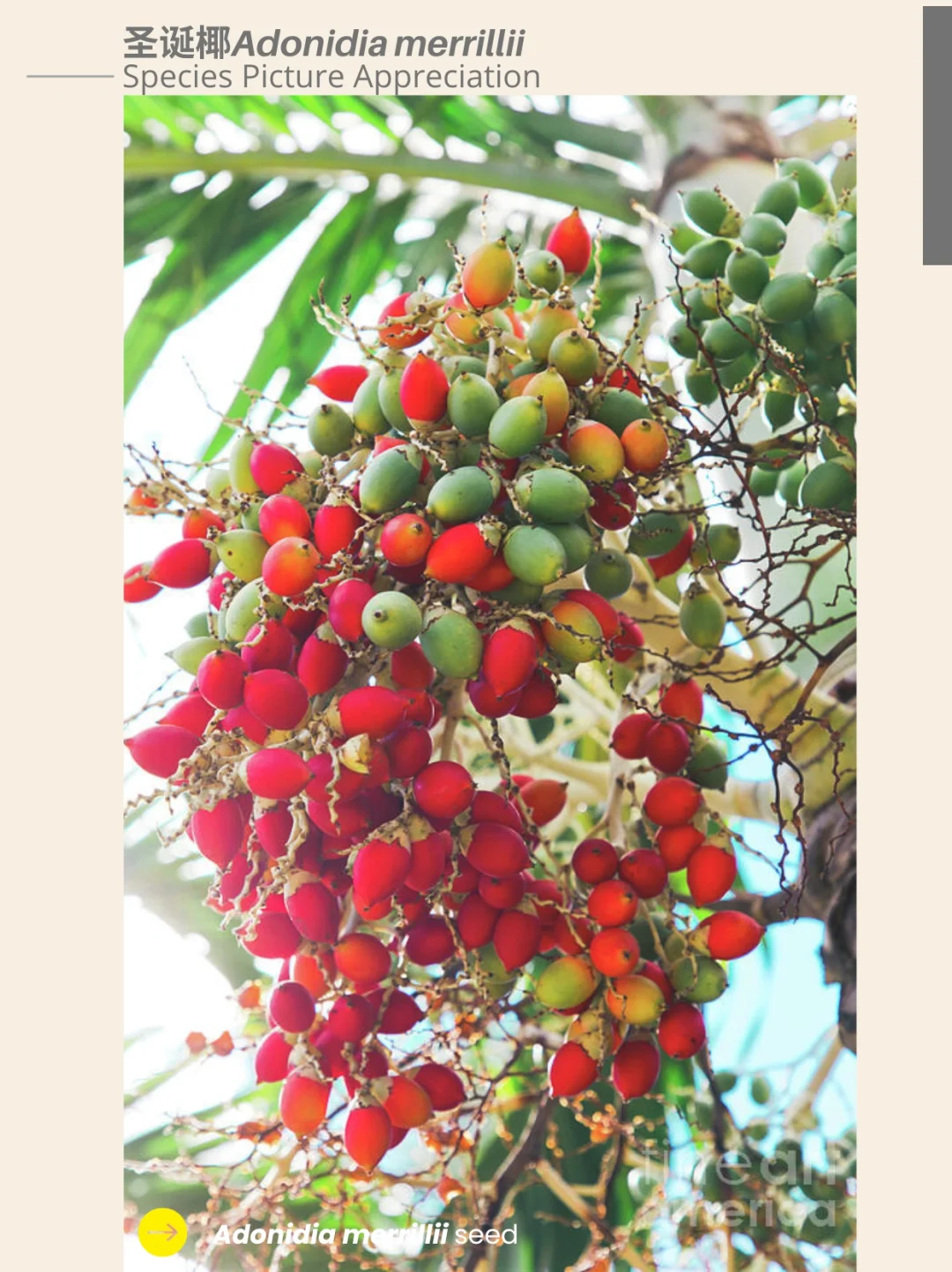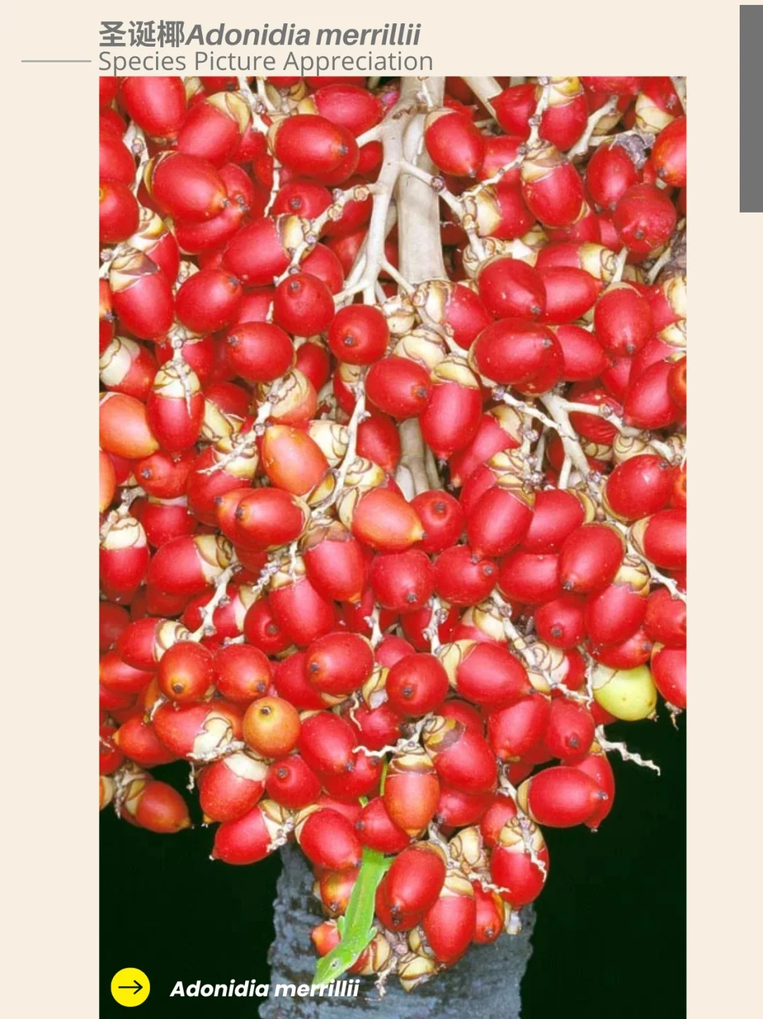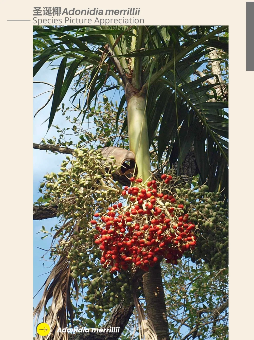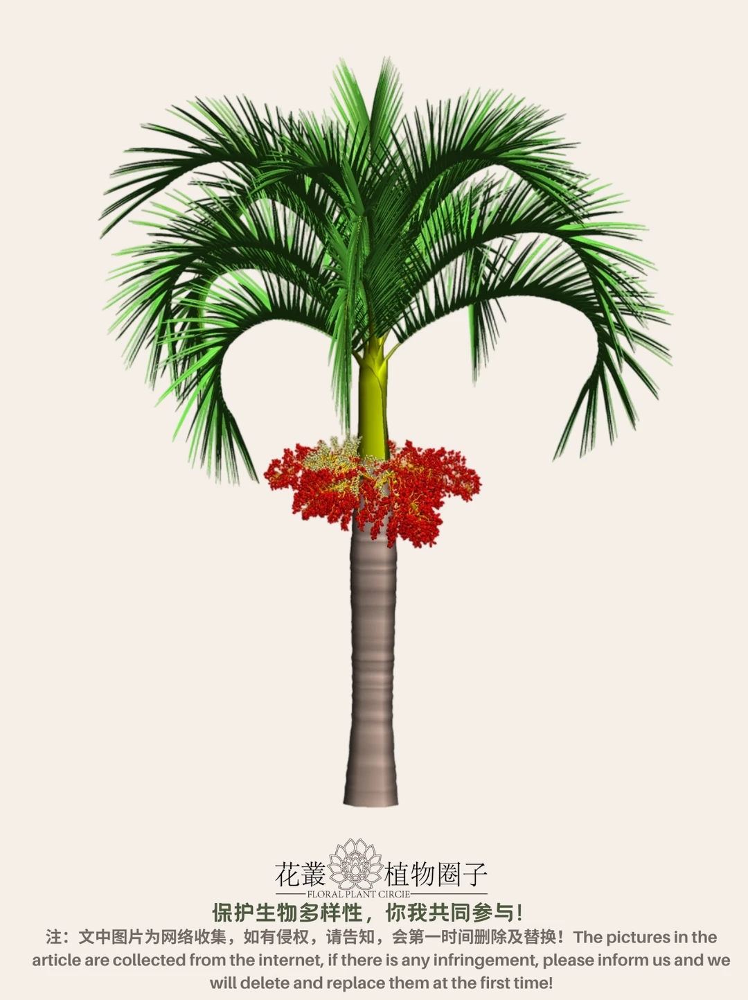 树种。该棕榈在东亚地区经数百年栽培后,逐渐成为西方地区的常见树种。据报道,其已在西印度群岛和佛罗里达州归化。因其果实冬季会呈现鲜艳的猩红色,故俗称“圣诞棕榈”。该棕榈通常体型较小且纤细,通常可达8米高,但个别植株可超过10-12米高。幼株通常保持5-7片叶,随着树龄增长逐渐形成冠层,成熟时叶片数可达10-12片。