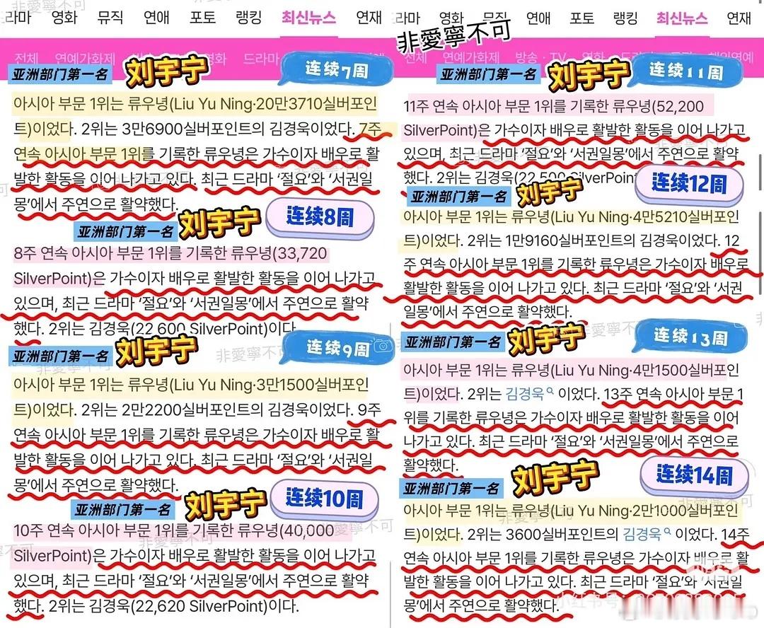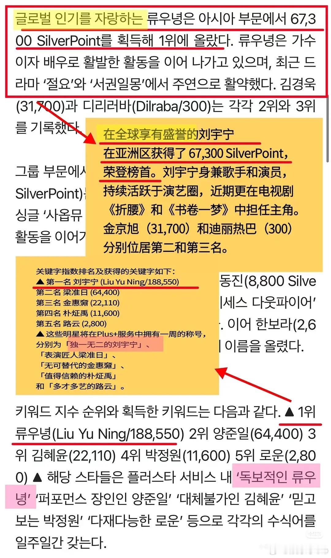 刘宇宁海外人气轻轻地爆了,🇰🇷榜单上已经连续14周蝉联第一自从折腰书卷引进韩国电视台之后他人气飙升,这个榜单只有韩国本地粉丝能投,已经断层第一三个多月了,看来韩国是真的很吃他的颜