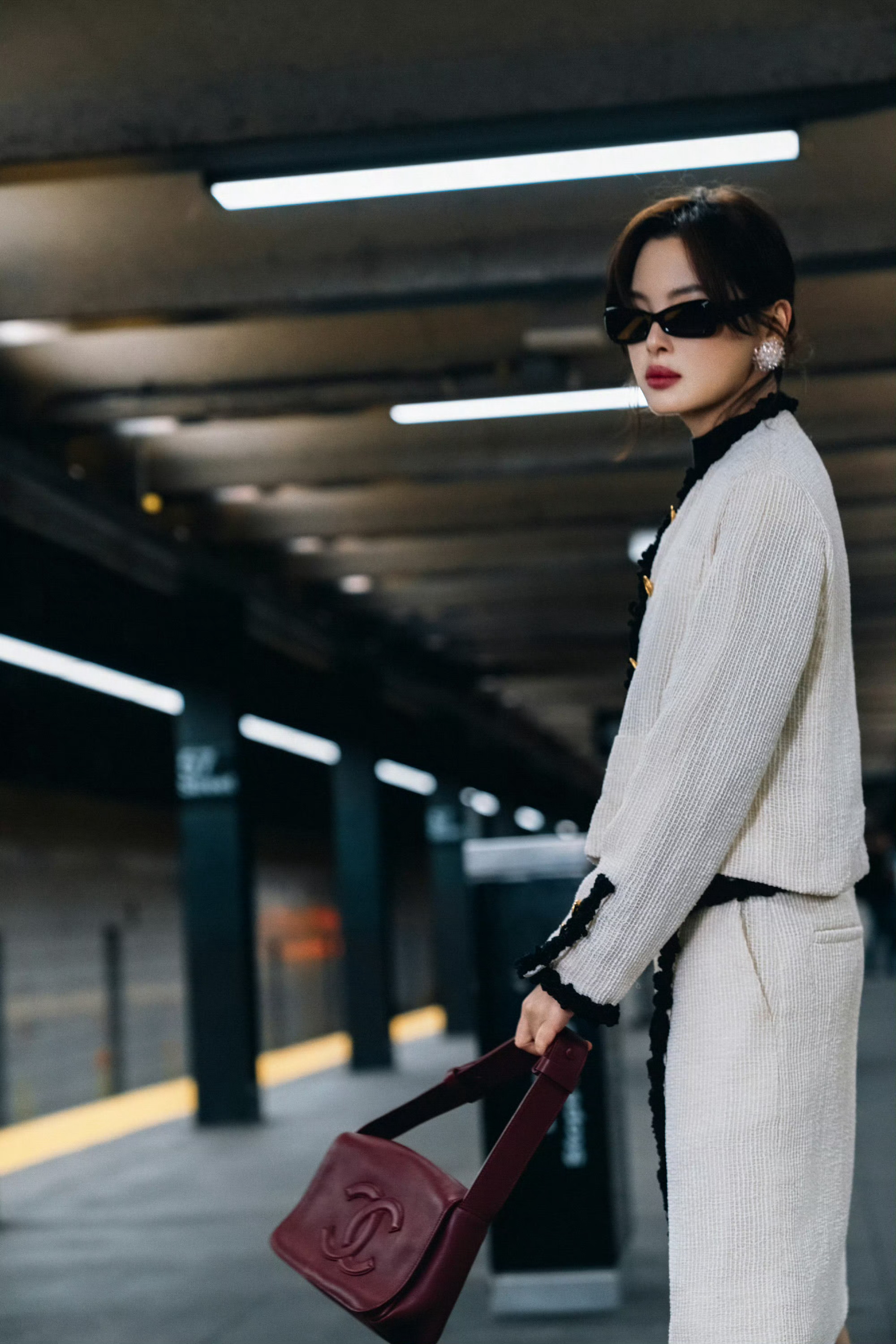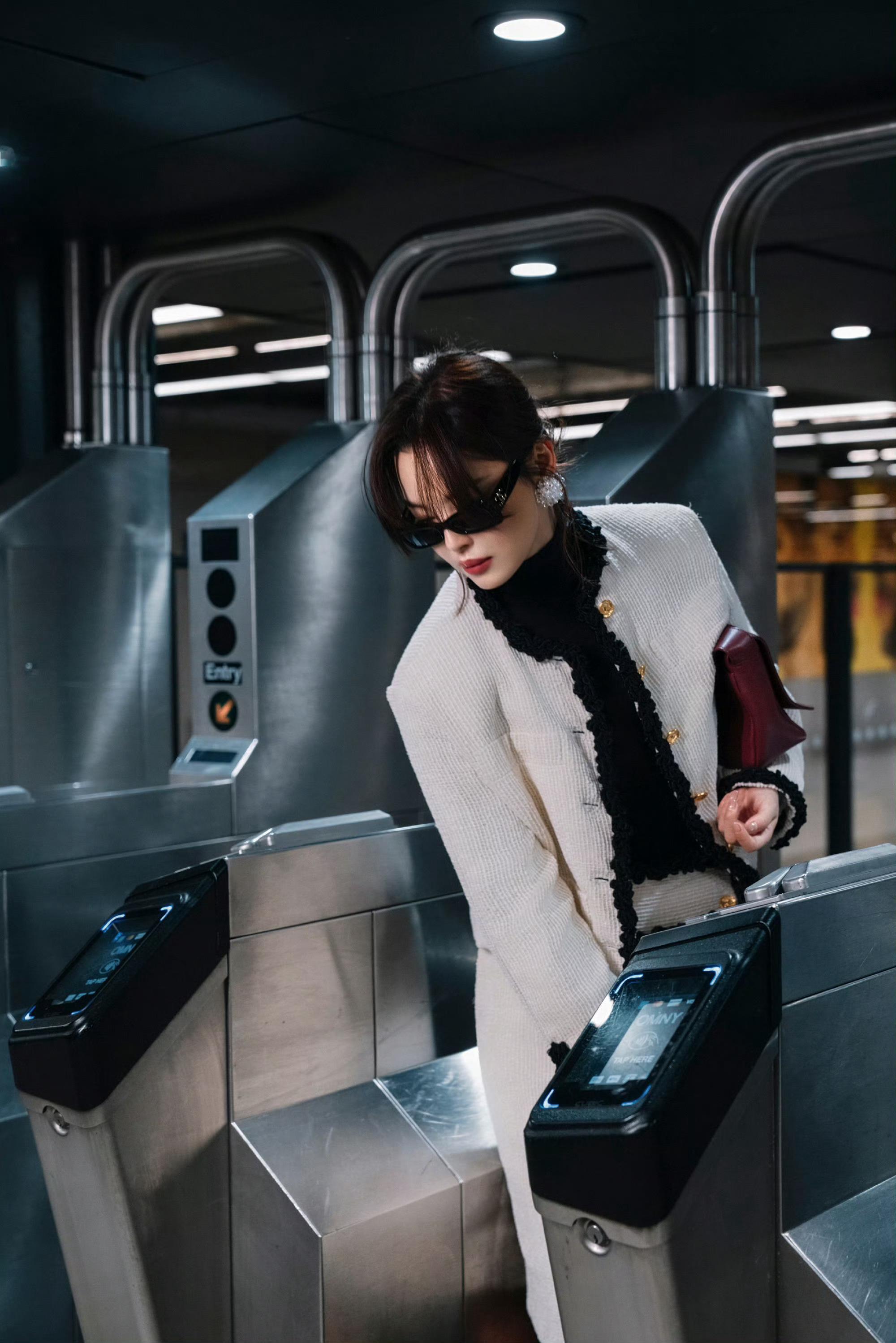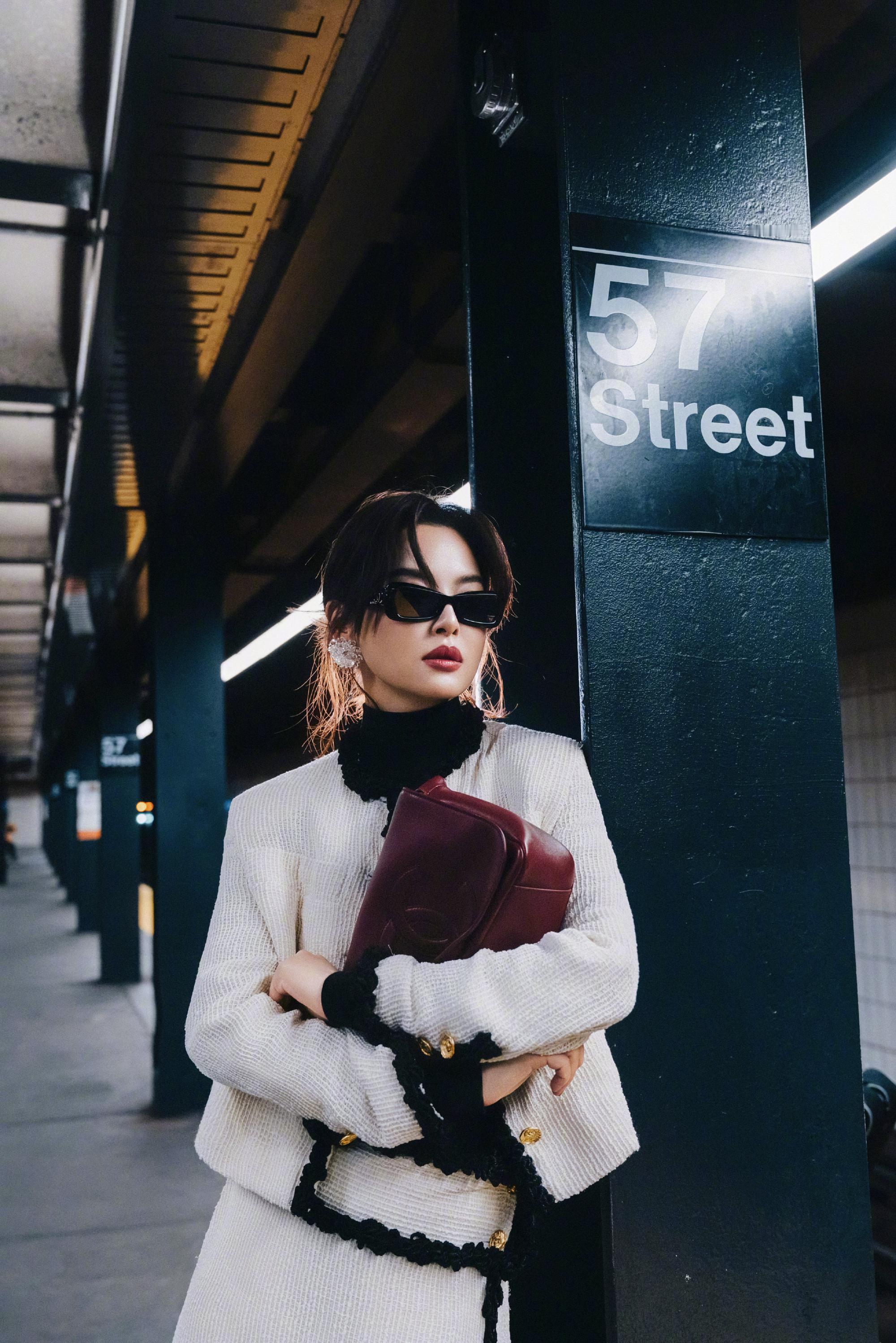 辛芷蕾 in CHANEL 📷 即将亮相香奈儿2026高级手工坊系列纽约发布会,身着26春夏系列出镜,黑色编结滚边装饰的白色斜纹软呢套装,搭配酒红小羊皮手袋,再戴上一副墨镜,简约优雅的摩登都市女郎形象。