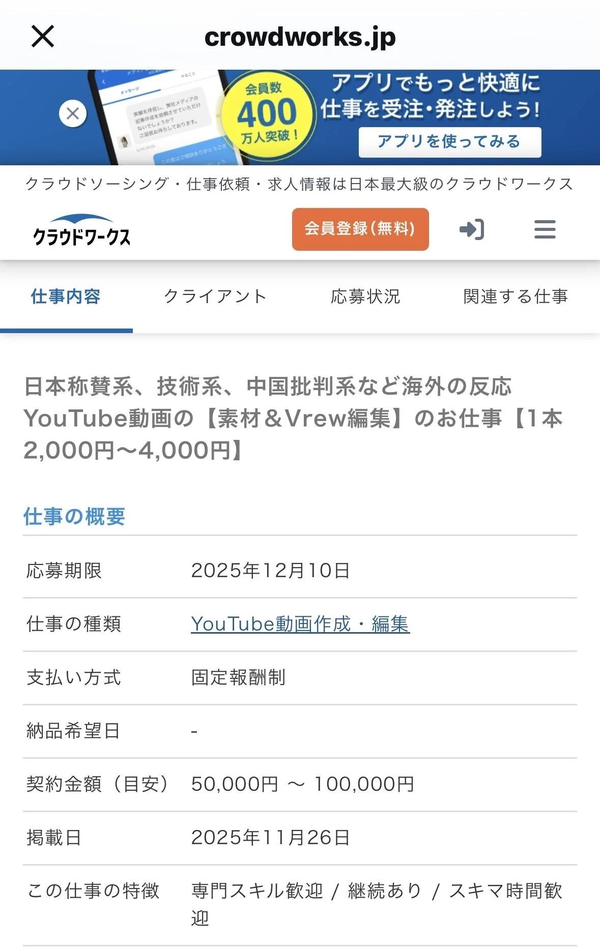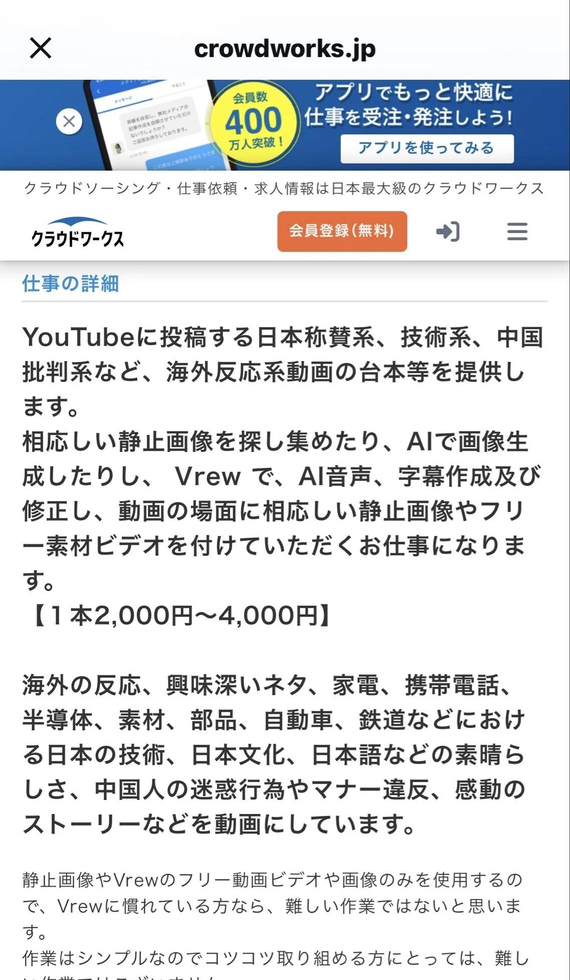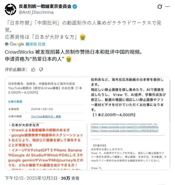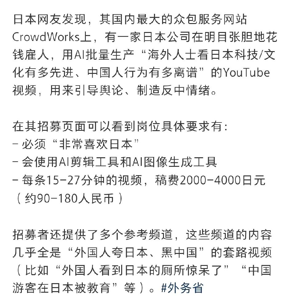 日本发力了,90块以上发一条黑中国、吹日本的视频。 这是出现在日本某知名服务网站的招募信息。我不知道这纯粹是日本民间所为,还是背后有日本政府的资助,不过我相信未来几天,这类视频会出现在国内互联网上。 毕竟,中国人太多,不说日本人了,二鬼子数量也不少,有的还自带干粮,现在有钱拿了,那不更带劲。