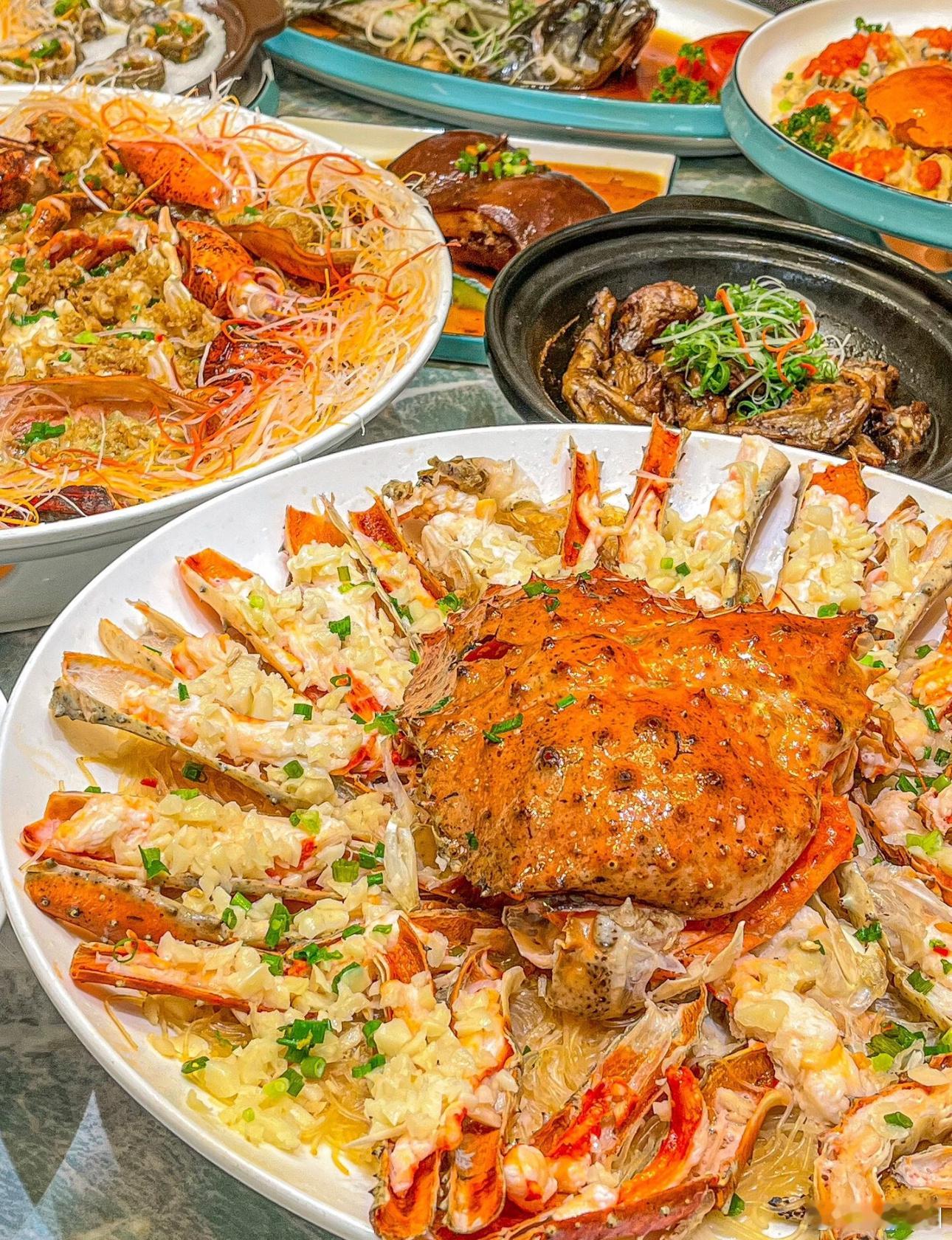 美食分享清蒸帝王蟹蒜蓉蒸波士顿大龙虾蒜蓉盐焗海螺肉沫蒸蟹膏