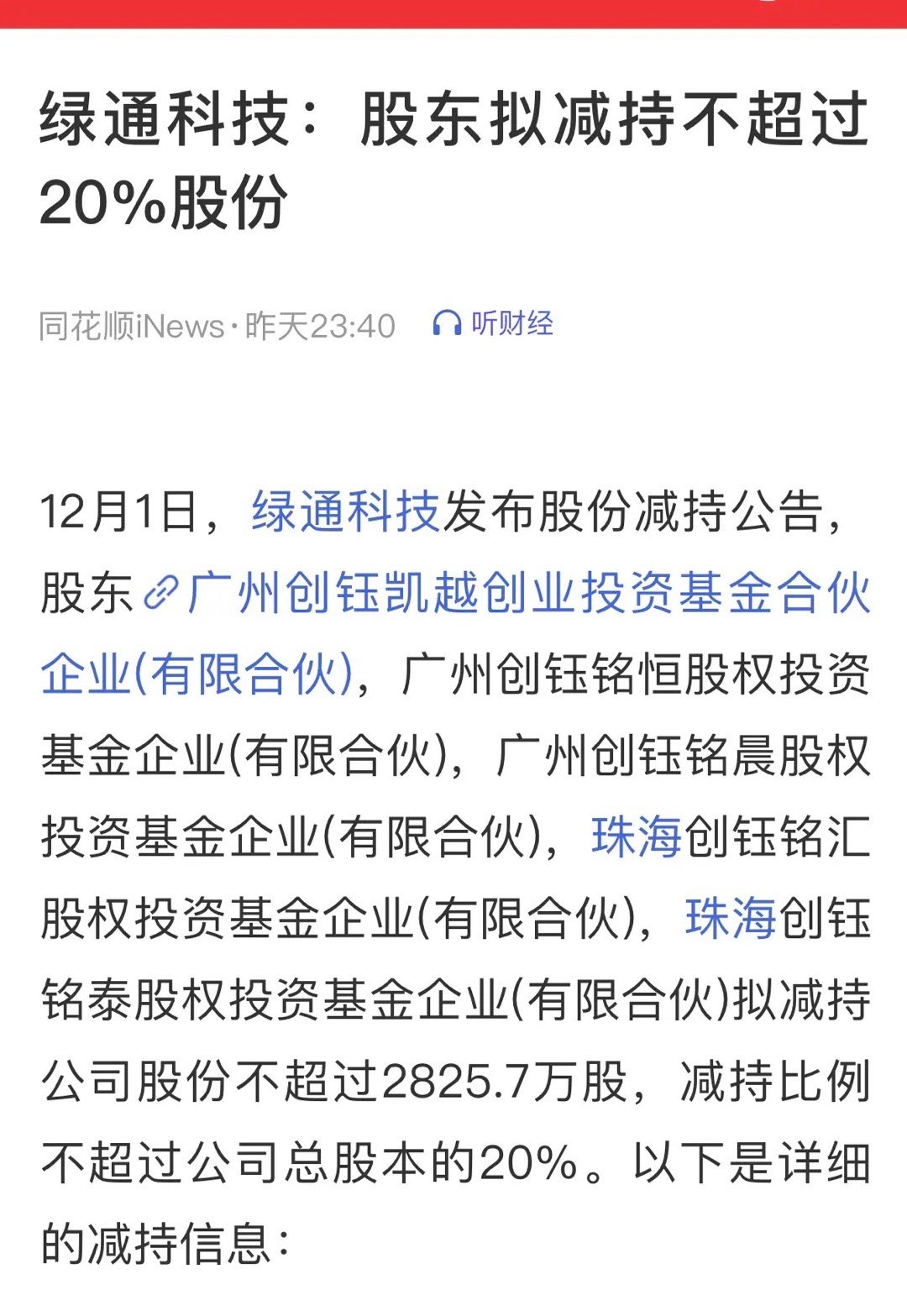 绿通科技,多位股东拟减持总股本比例20%的股份!一次性减持公司股份五分之一!绿通科技于2023年3月6日在创业板上市,发行价格为131.11元/股,该公司拟募集资金40,494.96万元,实际募集资金总额为人民币229,311.39万元,超募4倍多!2023年3月9日,绿通科技盘中最高价报149.50元,为该股上市以来最高价。该股目前股价为27.79元。该公司近三年净利润分别下滑15.64%和45.98%以及44.23%。