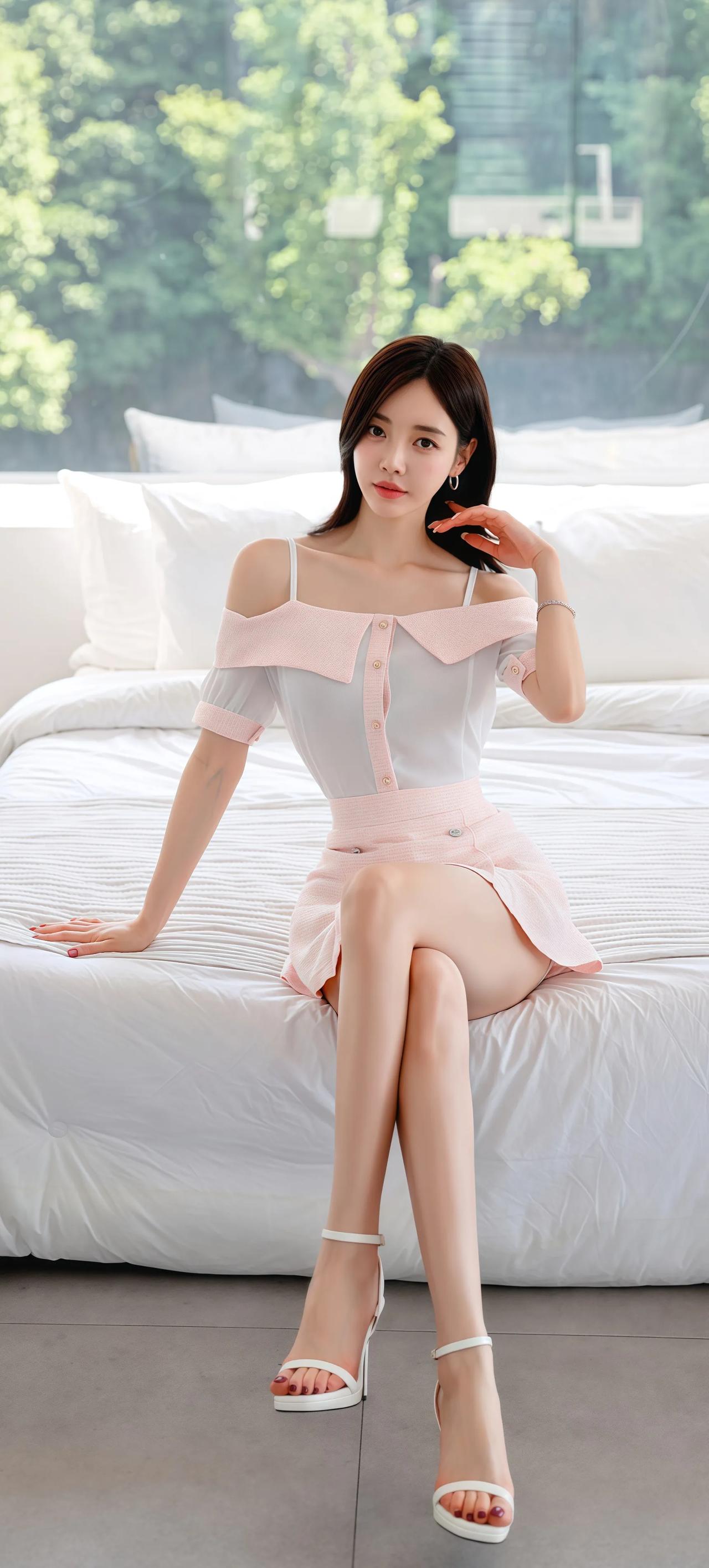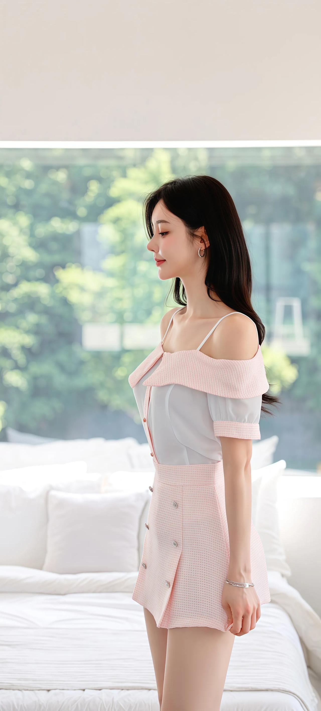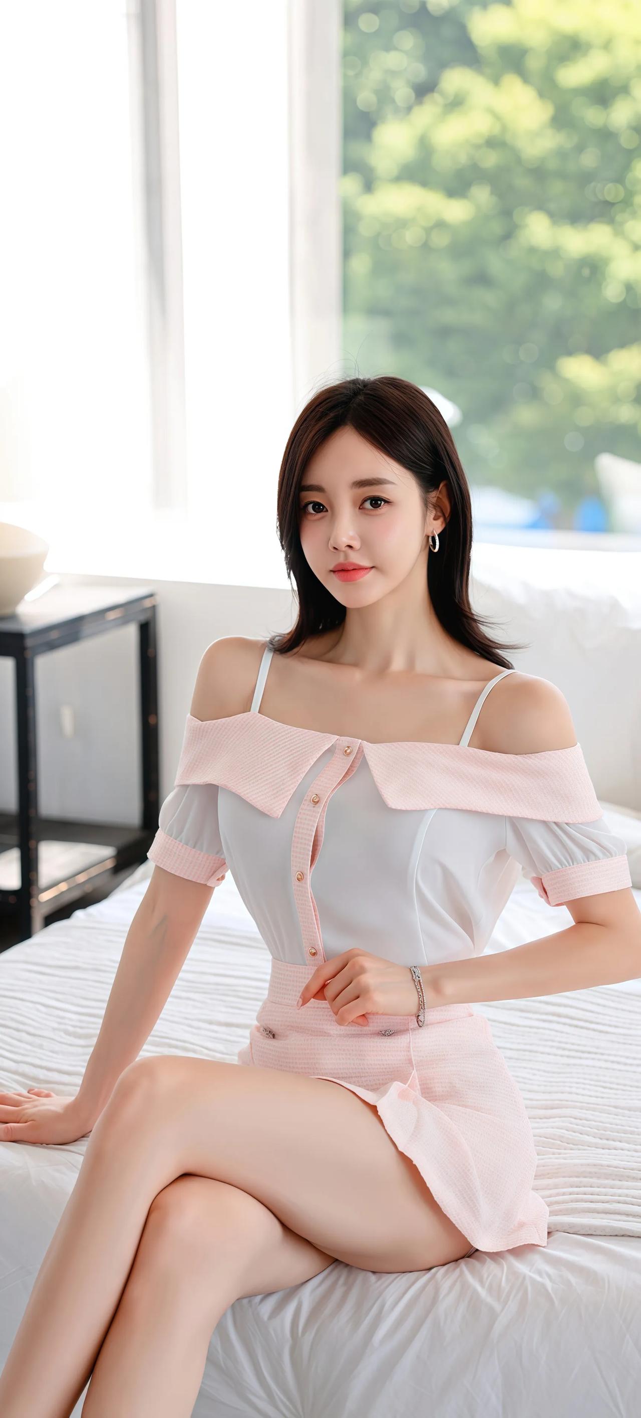 少女心满满,粉色连衣裙,坐在窗边,阳光洒满全身