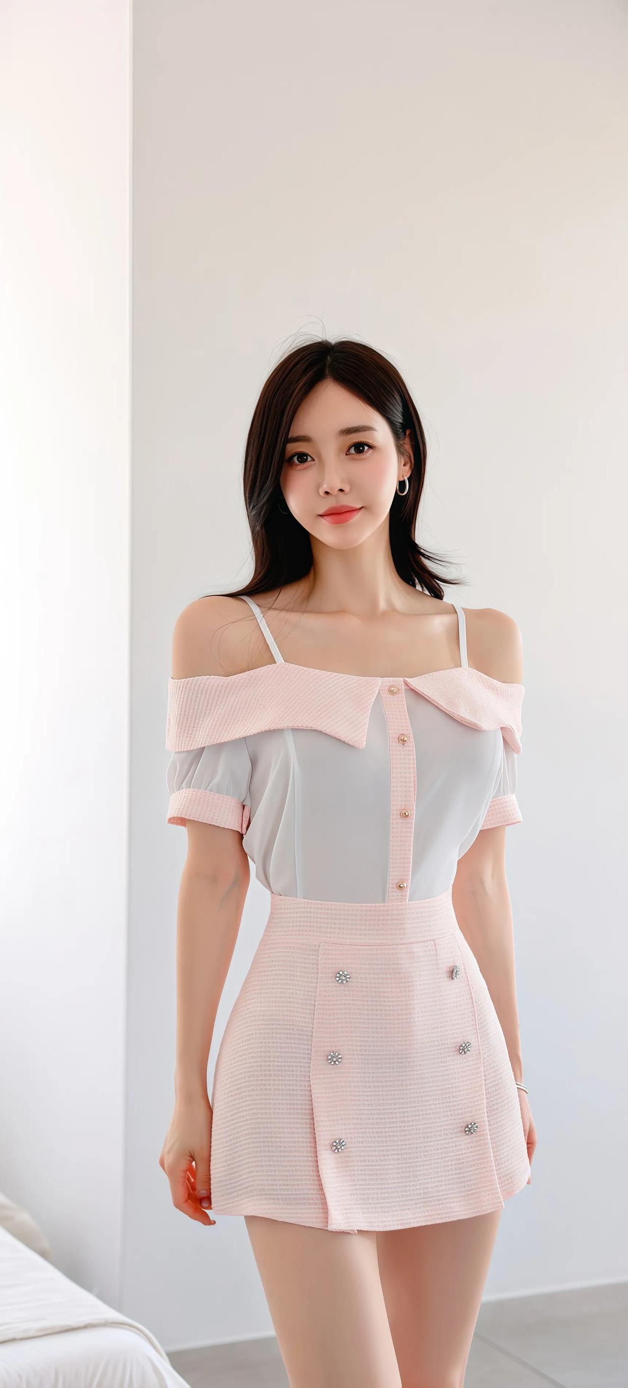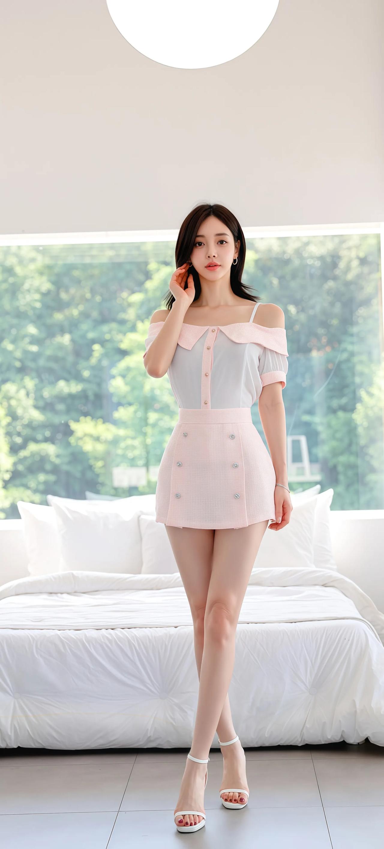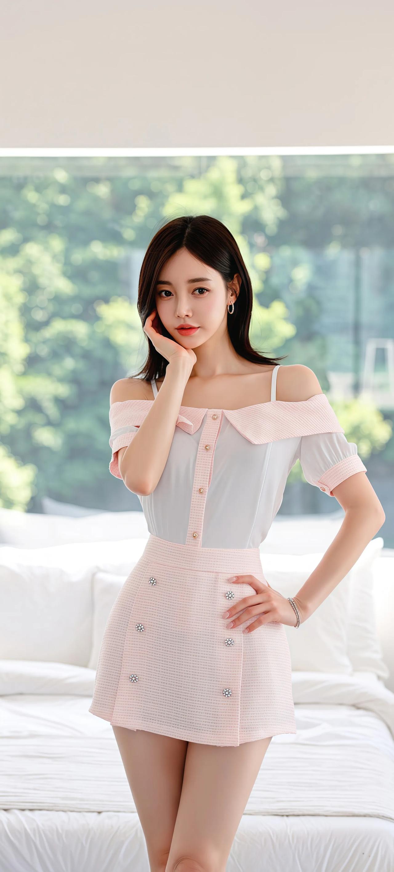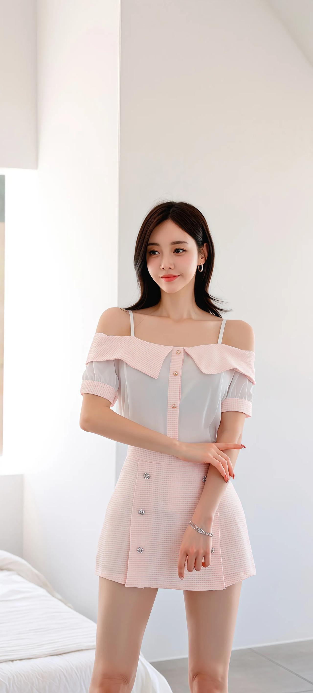 少女心满满,粉色连衣裙,坐在窗边,阳光洒满全身