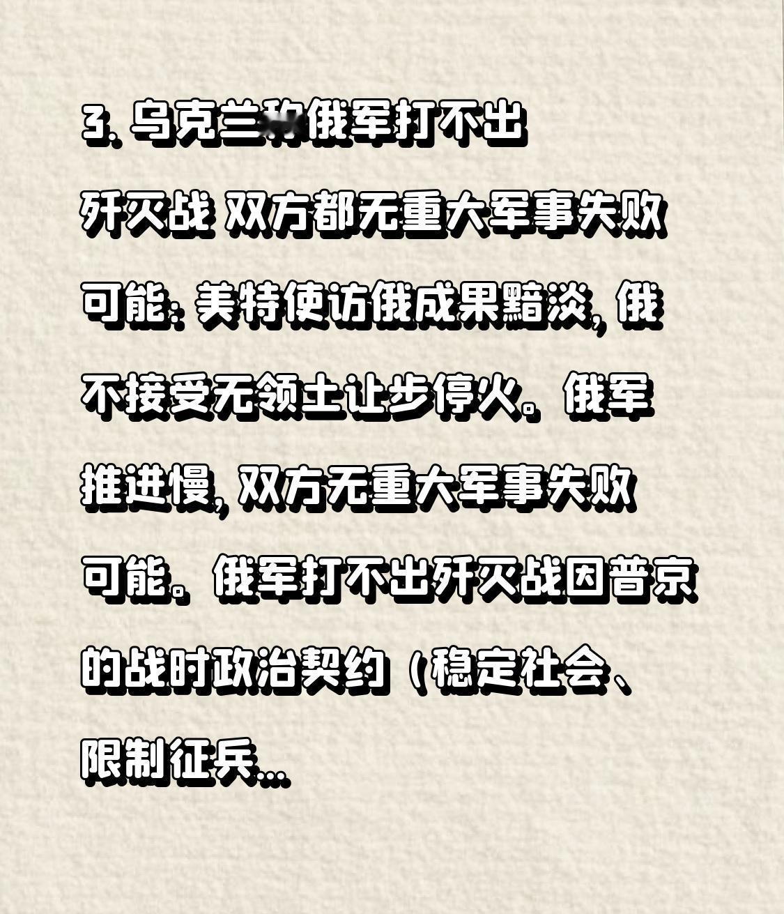 3. 乌克兰称俄军打不出歼灭战 双方都无重大军事失败可能:美特使访俄成果黯淡,俄不接受无领土让步停火。俄军推进慢,双方无重大军事失败可能。俄军打不出歼灭战因普京的战时政治契约(稳定社会、限制征兵、用志愿兵和私营武装,高阵亡赔付),俄擅长战略适应对持久战更关键。