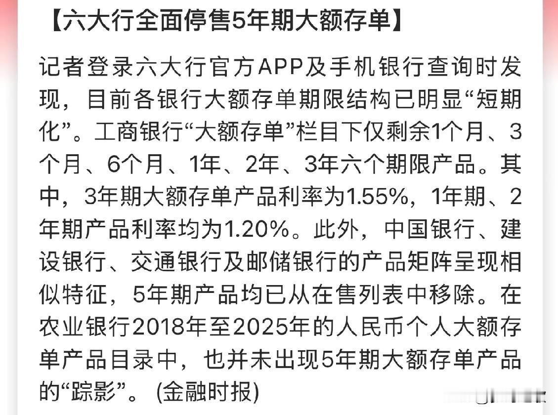 银行变相“降息”,5年存单已经成为历史 银行的最新存单表上已经没有了5年期大额存单产品,也就是说储户再想长期存钱,只能选择3年期存单,利率只有1.55%,还不如拿钱去投资,这也是银行想要看到的。 银行此举就是抑制存钱的热情,以达到刺激经济的目的,变相的放水。因为国内存钱的总数一直在增加,而消费始终处于低迷的状态。 只有把钱激活起来才是经济,不然躺在银行里面只能是冷冰冰的数字,主要也是因为自从房地产低迷,实体店不好做之后,银行房贷成为了一个难题。 此次5年期存单的消失只是一个前兆,如果存款还在增加可能还会延续但3年前存单。