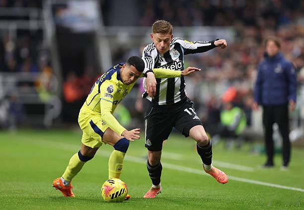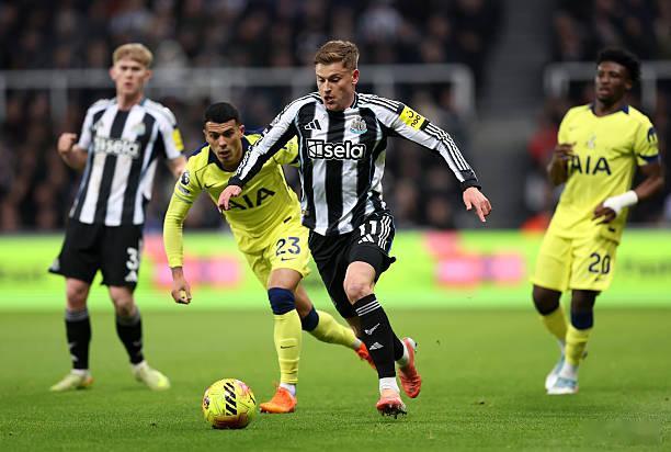 纽卡斯尔vs热刺 英超确实是一个非常强调身体对抗能力的联赛。热刺的身体对抗看着就比纽卡斯尔弱不少。我们印象里的乌拉圭球员都是狠角色吧?但本坦库尔根本扛不动巴恩斯。第17分钟,热刺中线附近的边线球,波罗与贝格瓦尔配合,贝格瓦尔身体对抗不行,球被断了;巴恩斯左路突破,本坦库尔的身体对抗能力太差了,巴恩斯传中,麦利弧顶发炮,球打得比较正,门将维卡里奥稳稳扑住。这巴恩斯确实壮实,波罗也扛不动他。