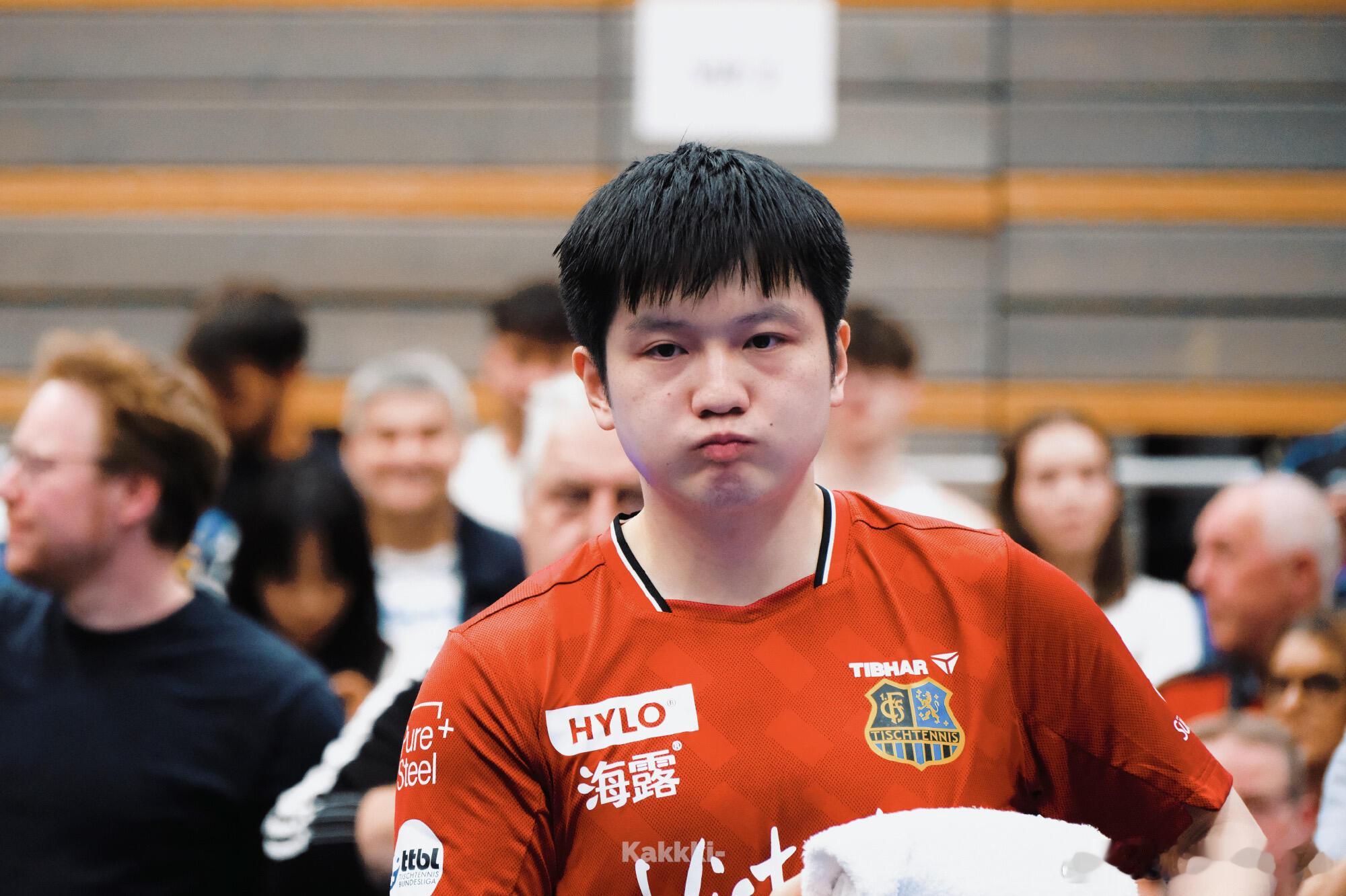 全运赛场上的樊振东打球的气势依旧霸气十足。