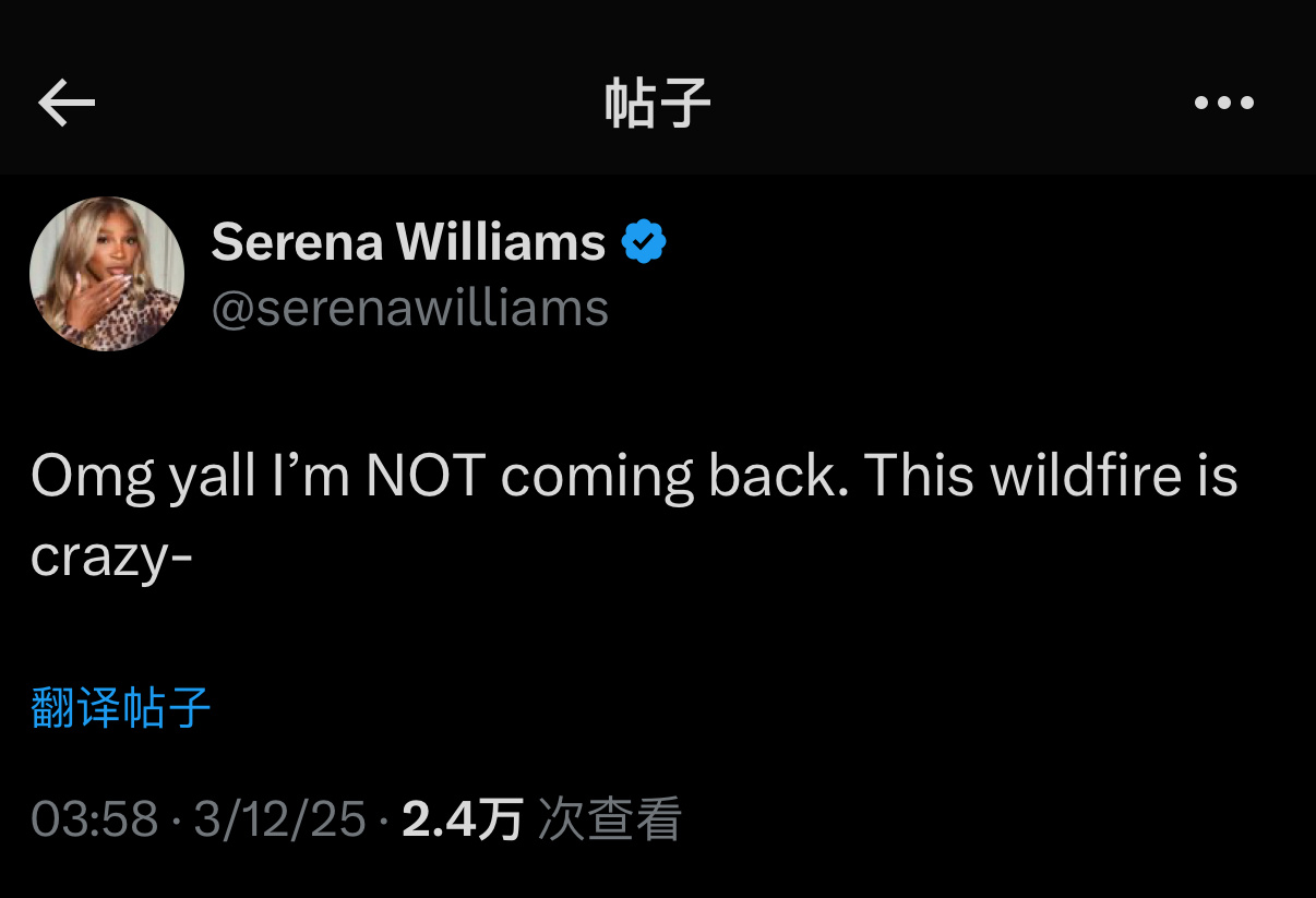 外媒发现,小威的名字突然出现在了ITIA公布的网球反兴奋剂检测名单中,这是参加正式比赛的必要条件。于是各家纷纷猜测,这位23届大满贯单打冠军得主可能在2026年重返职业网坛。眼见舆论越来越逼真,小威本人赶紧下场声明:我不会复出的 小威辟谣复出传闻