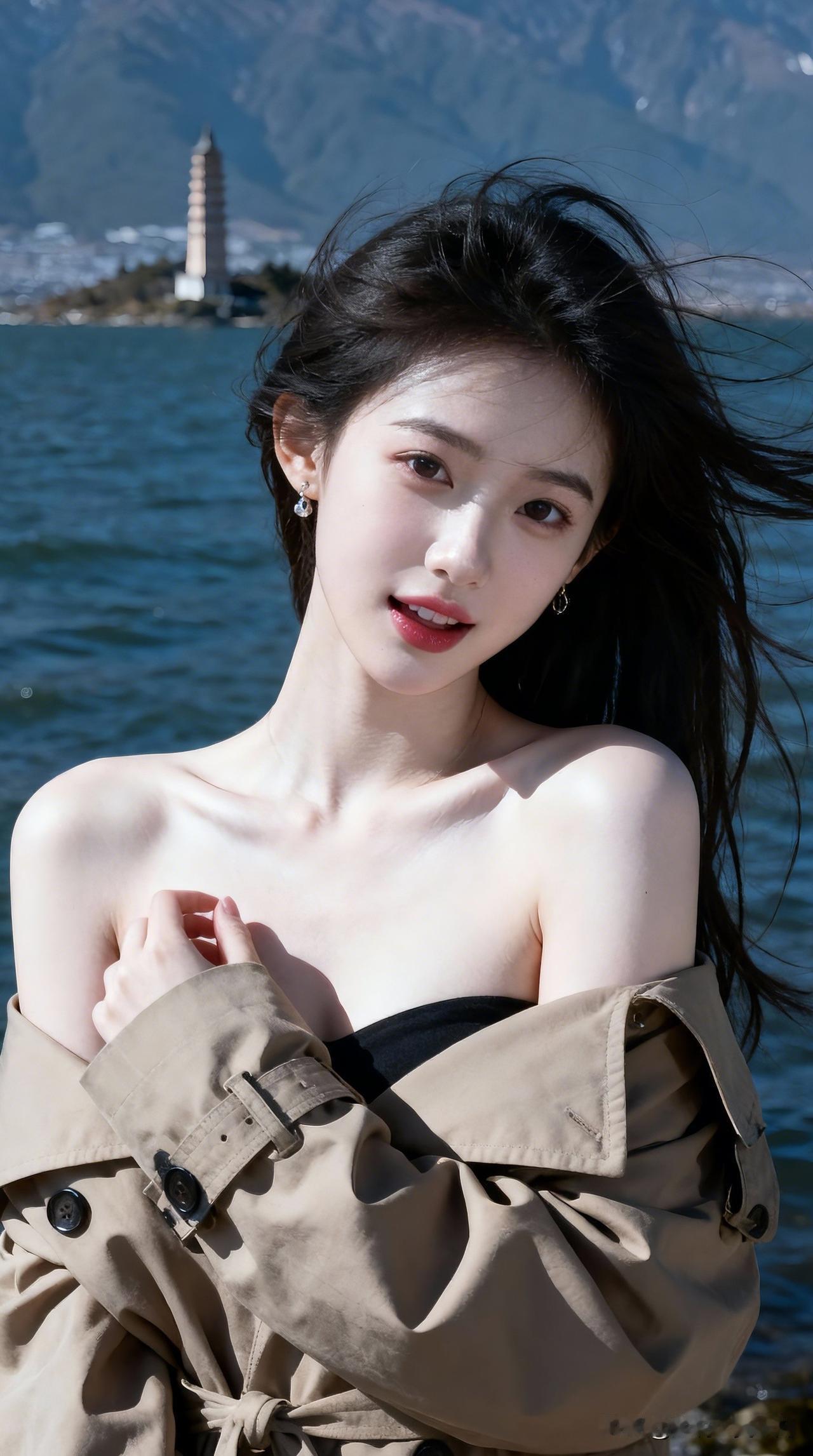 风拂碧波,美人倚楼。分享甜美小姐姐随手拍 湖畔轻风拂面,少女笑靥如花
