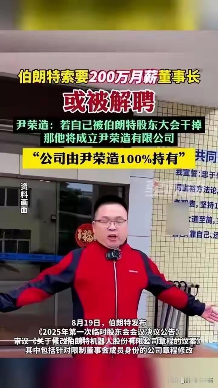 广东伯朗特机器人制造公司创始人尹荣造,真是把“离谱”刻在了骨子里。这家公司创立17年,不咋搞研发,倒是总“被查”,还连续4年亏损超4亿。 本月初董事会上,尹荣造先提把未来十年净利润减1元转他个人账户,这提案太疯狂,没通过。接着又提每年拿2400万年薪,要知道全国上市公司老总拿2000万年薪以上的都没几个。他这要求股东哪能接受,投票时除一人赞成,其他人全反对。股东怒斥他“掏空公司”。他月薪涨到200万才一个月,就被股东踢下了场。最新人事通告里,他名字都没了,真是大快人心!