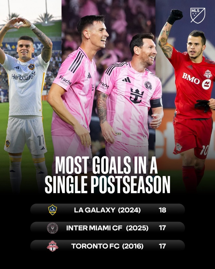 据美职联官方统计,迈阿密国际本赛季美职联5场季后赛打进17球,美职联历史单届季后赛进球并列第二多,差1球追平洛杉矶银河保持的纪录。