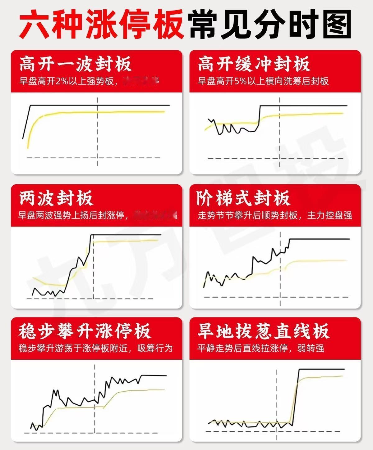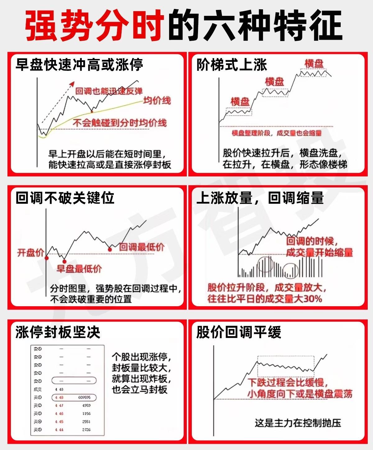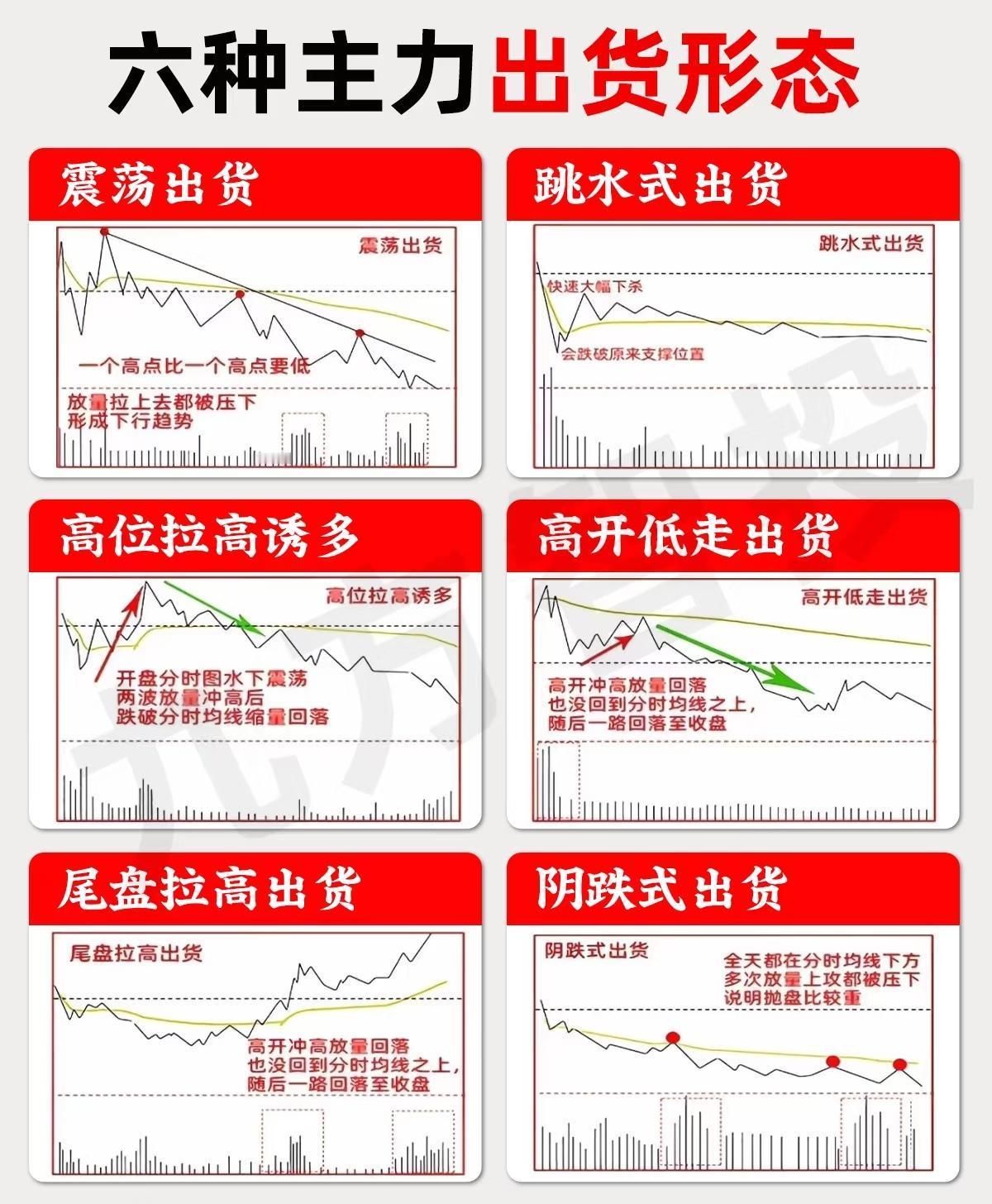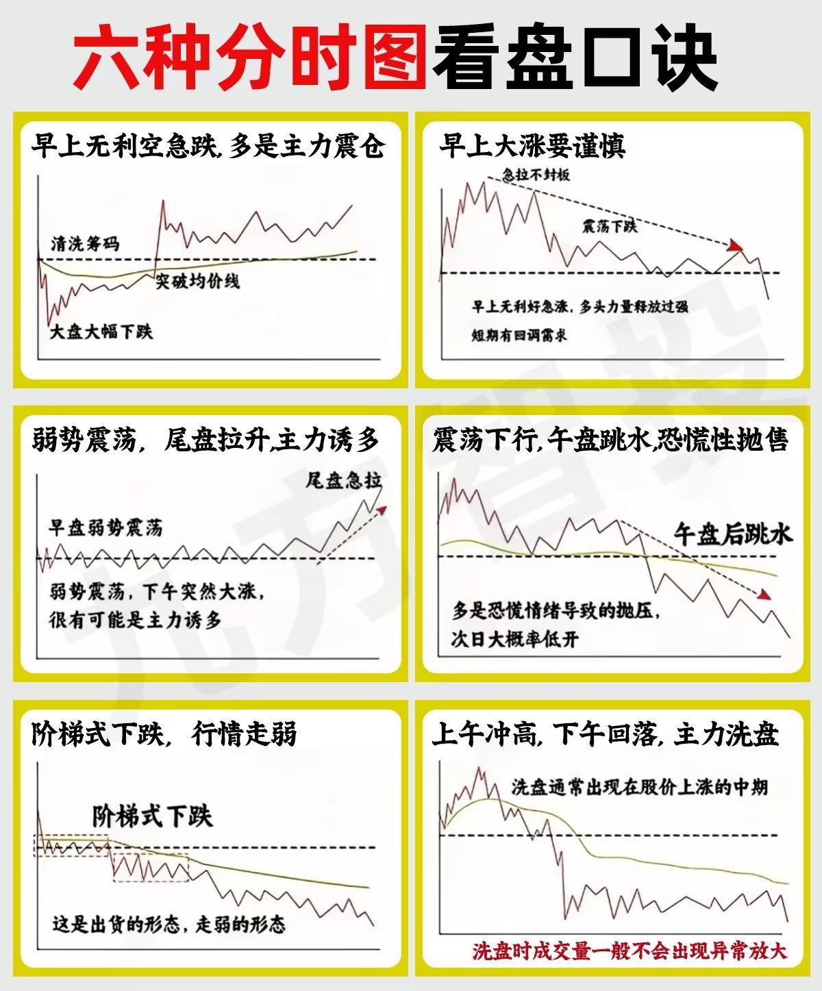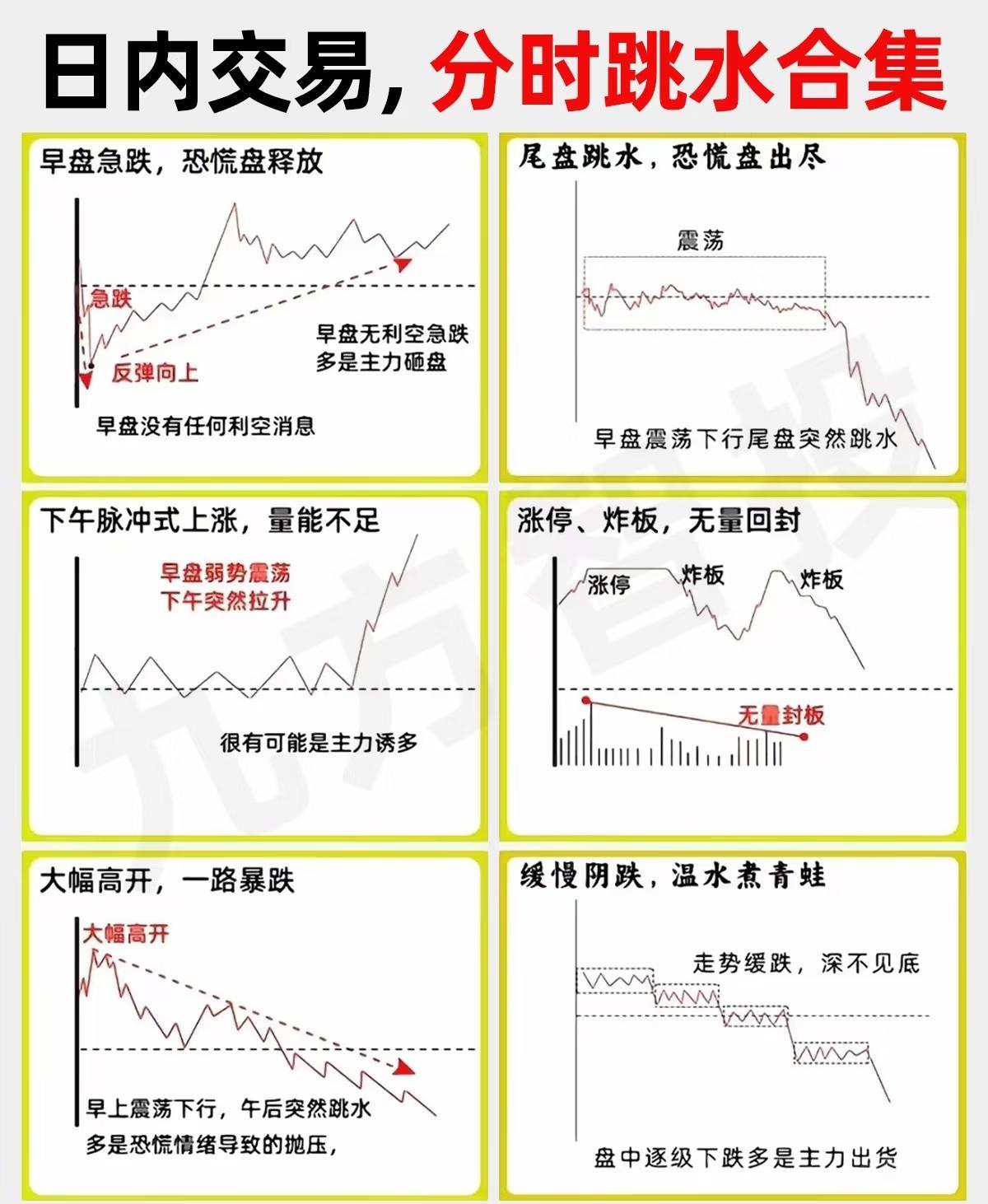 股票分时图分析,涵盖常见形态、看盘口诀、涨停板类型、主力出货形态、强势分时特征及日内重点图形等内容,具体总结如下:第一张图聚焦“分时图常见形态”,以“破线看空”为核心,讲解两种典型情况:一是均价线由升转平再下行,股价跌破均线;二是均价线持续下降,股价跌破盘整区且量能放大。同时提及“突破看多”(均价线上升,股价突破盘整区且量能放大)、“急跌勾头”(均价线下行,股价急跌后快速回升)等其他形态。第二张图为“六种分时图看盘口诀”,强调早盘走势的关键信号:如“早上大涨要谨慎”(无利好急涨致多头力量过强,短期或回调)、“弱势震荡尾盘拉升多为诱多”、“午盘跳水多因恐慌抛售,次日或低开”、“阶梯式下跌属走弱出货形态”等,提示不同分时走势背后的主力意图与后市风险。第三张图属“六种涨停板常见分时图”,展示“两波封板”形态:早盘经两波强势上扬后封涨停,凸显做多势头强劲,黑色折线清晰呈现“拉升-短暂回调/横盘-再拉升封板”的过程,黄色均价线提供参考基准。第四张图解析“六种主力出货形态”中的“高开低走出货”:表现为高开冲高放量回落,未回到分时均线之上,随后一路下行至收盘,配合K线与成交量图说明主力通过冲高诱多后出货的特征。第五张图围绕“强势分时的六种特征”,重点展示“回调不破关键位”(强势股回调不跌破开盘价、早盘最低价等重要位置)与“上涨放量,回调缩量”(拉升时成交量较平日放大30%,回调时缩量),辅以折线图与成交量柱状图直观说明强势股的量价特征。第六张图属“日内分时图重点图形”,聚焦“一致转分歧”区域,包含三种子图形:“二次烂板分歧”(高位横向震荡后向下破位)、“多次烂板分歧”(高位反复震荡形成多个未有效封板的“烂板”后下行)、“尾盘放量分歧”(多数时间横盘,尾盘突然放量下跌),均配成交量柱状图辅助判断。第七张图为“日内交易,分时跳水合集”的最后一张,主题为“缓慢阴跌,温水煮青蛙”:价格曲线从左上向右下缓慢持续下滑,偶有小幅整理平台,整体趋势明显,标注“走势缓跌,深不见底”,说明此为盘中逐级下跌的主力出货表现,易消耗多方力量导致大幅下跌。