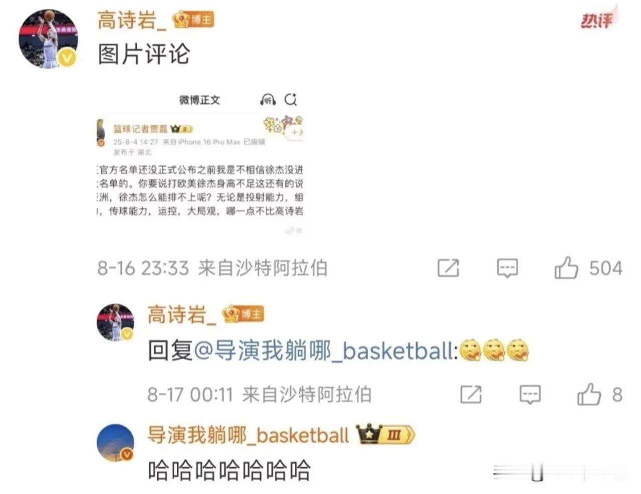 中国男篮世预赛的惨败,球迷对郭士强指导带的后卫都有很大的意见,质疑高诗岩和王岚嵚都能进国家队,为什么徐杰和孙铭徽不行? 网友点评男篮:顶级后卫在家谈恋爱,三流混子在为国争光!徐杰回复:哈哈有梗! 网友为孙铭徽鸣不平:孙总是抗韩名将,怀念他扛起抗韩大旗的那一刻!孙铭徽直接回复:都八年前的事,得往前看! 看得出来,徐杰和孙铭徽落选中国男篮还是有想法的,孙铭徽的回复还算是理智,而徐杰这么说,肯定会得罪人的,但也有他回应的道理,毕竟亚洲杯期间,高诗岩曾拿贾磊记者对徐杰不比高诗岩差为什么进不去国家队的点评和辽宁篮球博主导演互动,来暗嘲徐杰。
