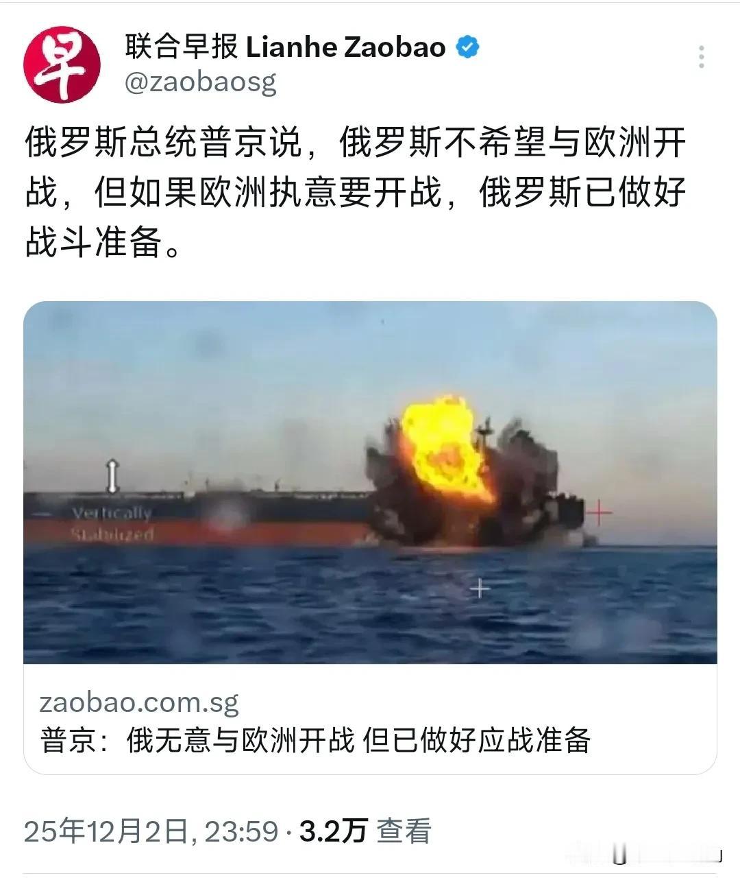 新加坡联合早报昨晚(12月2日晚)报道:“俄罗斯总统普京说,俄罗斯不希望与欧洲开战,但如果欧洲执意要开战,俄罗斯已做好战斗准备。” 评几句 普京这番话,表面上是“留有余地”,骨子里却是“刀已出鞘”。所谓“不愿打”,不过是把开战的道德包袱甩给布鲁塞尔;一句“已准备好”,则把核底牌拍在了谈判桌上。黑海油轮余烟未散,克里姆林宫就顺势把“受害”叙事升级成“应战”宣言——既安抚国内鹰派,又试探北约阈值。与其说是不希望打仗,不如说是告诉欧洲:真想玩火,莫斯科不介意把冬天再烧旺一点。