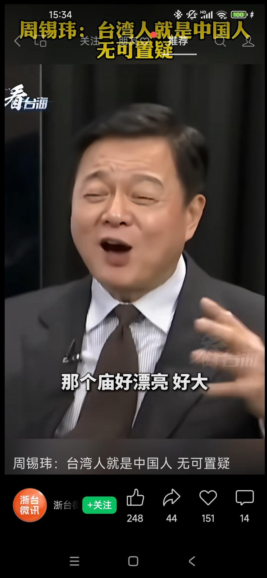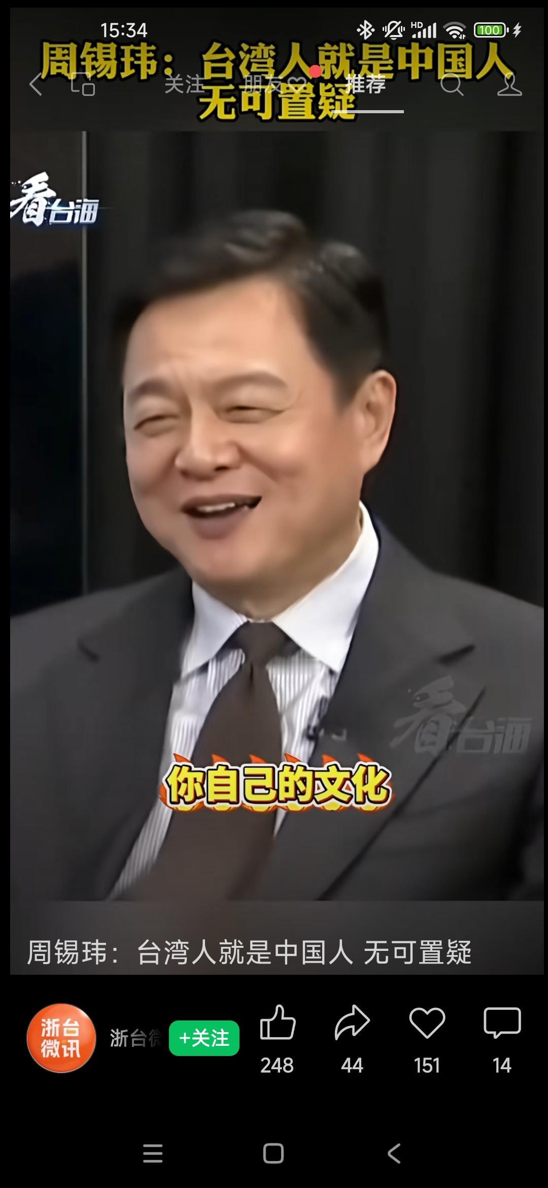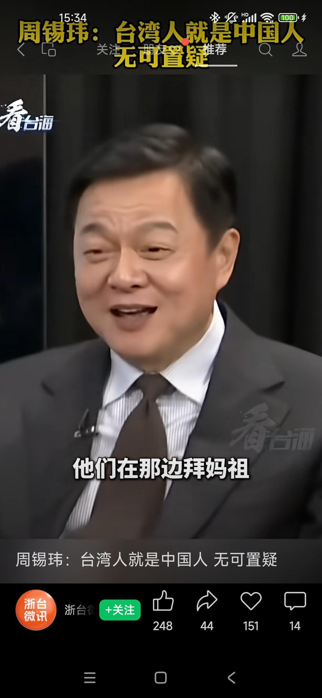 周锡玮:台湾人就是中国人,无可置疑! 台湾人就是中国人,那不是事实吗? 你从拜妈祖这件事就可以知道了。 我到昆山,他们在那边拜妈祖啊,那个庙好漂亮,好大。 台湾很多人都去了,和台湾一模一样的。 你自己的血缘,你自己的文化,你自己的宗教,你自己的信仰,连你的饮食,哪一个不是中国人的? 都是的! 编者:可叹周县长肺腑之言!