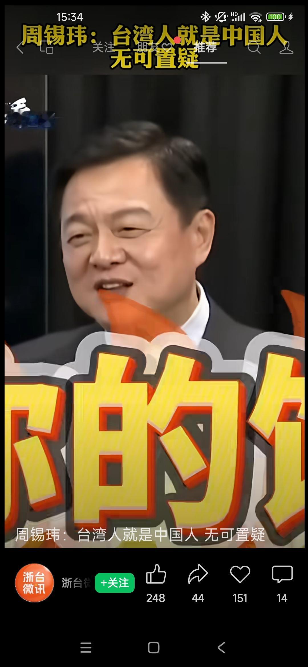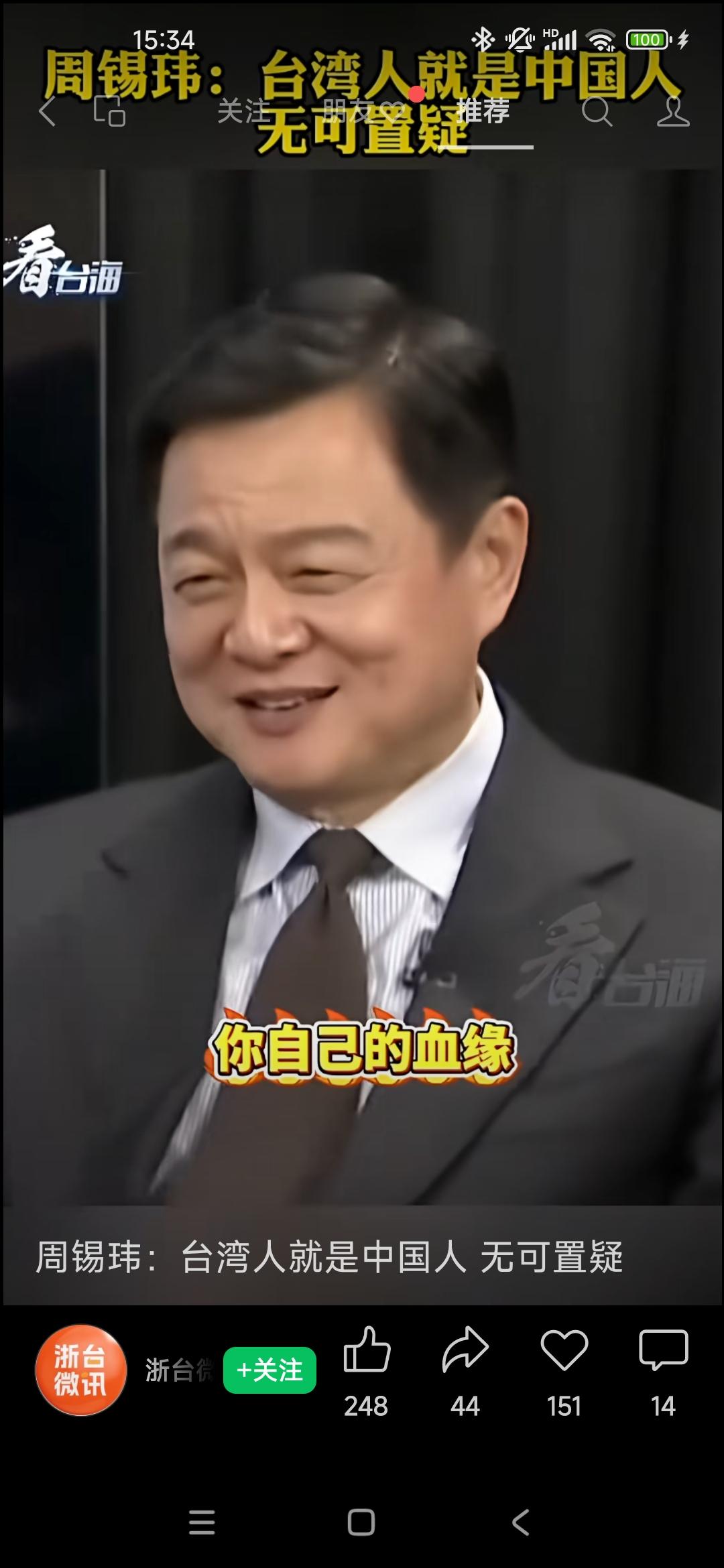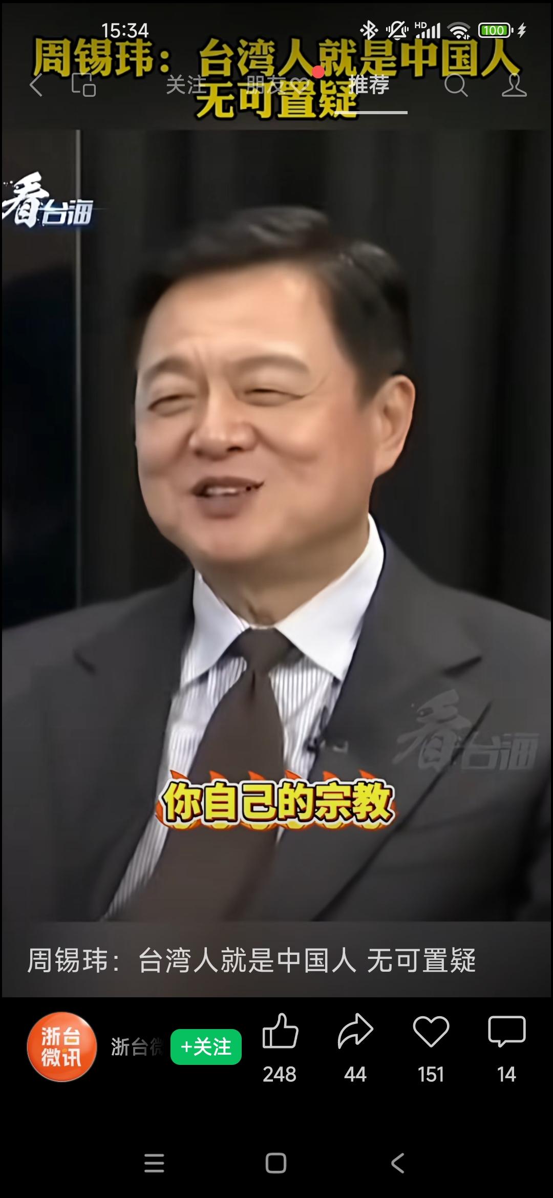 周锡玮:台湾人就是中国人,无可置疑! 台湾人就是中国人,那不是事实吗? 你从拜妈祖这件事就可以知道了。 我到昆山,他们在那边拜妈祖啊,那个庙好漂亮,好大。 台湾很多人都去了,和台湾一模一样的。 你自己的血缘,你自己的文化,你自己的宗教,你自己的信仰,连你的饮食,哪一个不是中国人的? 都是的! 编者:可叹周县长肺腑之言!